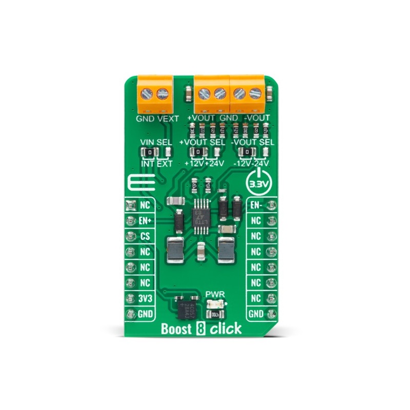 This is Boost 8 Click Boost Converter for LT1945 manufactured by Brand-Rex. The manufacturer part number is MIKROE-5468. It has a/an boost converter power management function . Featured Device lt1945. The kit is classified as development board. This kit is known as boost 8 click, consists of highly versatile and user-desired tools.