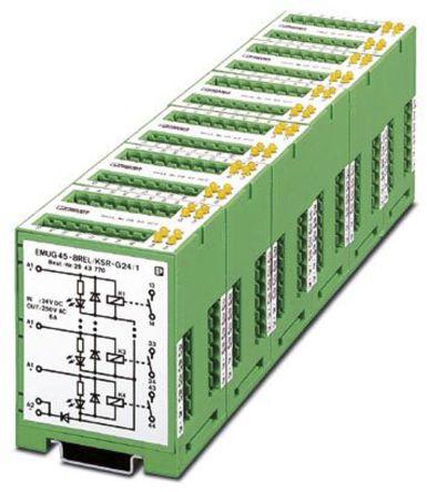This is manufactured by Phoenix Contact. The manufacturer part number is 2943770. It is capable of doing 20000000 cycles in a lifetime . The given dimensions of the product include 76 x 45 x 60mm. The product is available in din rail configuration. The product has -20 → +55°c of operating temperature range. The product emug 45- 8rel/ksr-g 24/1, is a highly preferred choice for users. It is integrated with 1 a switching current. The product comes in 45mm depth. In addition, the height is 60mm. Its accurate length is 76mm. It has about 12ma input current . Whereas, the minimum operating temperature of the product is -20°c. It has a 6ms turn On time. The given turn off time is 10ms. The terminal is a screw type. The contact is equipped with spno configuration. It has a maximum operating temperature of +55°c. The product is made from sturdy silver alloy materials. It is assigned with possible HTSUS value of 8536.41.0030. The product is rohs compliant. The coil voltage of the product is 24vdc. The product has -20°c ~ 55°c operating temperature range. It has a coil current of 12 ma. The coil is a non latching type. The product's switching voltage is 250vac, 250vdc - max. This is basically a general purpose. It is shipped in bulk package . It also has a 8pst-no (8 form a) contact form. Its typical moisture sensitivity level is 1 (unlimited). The operating time of the product is 6 ms. It has a contact current rating of 6 a. The splendid features of the product include diode, socket included. While 10 ms is its release time. The product is designated with the ear99 code number. Moreover, it corresponds to 29437, a base product number of the product. The product is made from sturdy silver cadmium oxide (agcdo) materials.
