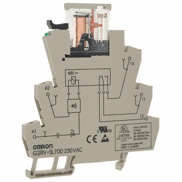 This is manufactured by Omron Automation and Safety. The manufacturer part number is G2RV-SL700 AC230. While the must release voltage is a 23 vac. It is assigned with possible HTSUS value of 8536.49.0050. The coil voltage of the product is 230vac. Moreover, it has screw terminal terminal style. The product has -40°c ~ 55°c operating temperature range. It is approved by ce, culus, tuv. It holds up to 31.5 kohms coil resistance. It has a coil current of 7.3 ma. The coil is a non latching type. The product's switching voltage is 440vac, 125vdc - max. On the other hand, 184 vac is the given crucial/must operating voltage. This is basically a general purpose. It is shipped in bulk package . It also has a spdt (1 form c) contact form. Its typical moisture sensitivity level is not applicable. The operating time of the product is 20 ms. It has a contact current rating of 6 a. The splendid features of the product include socket included. The product is available in din rail configuration. The product g2rv, is a highly preferred choice for users. While 40 ms is its release time. Moreover, it corresponds to g2rv-sl, a base product number of the product. The product is designated with the ear99 code number.