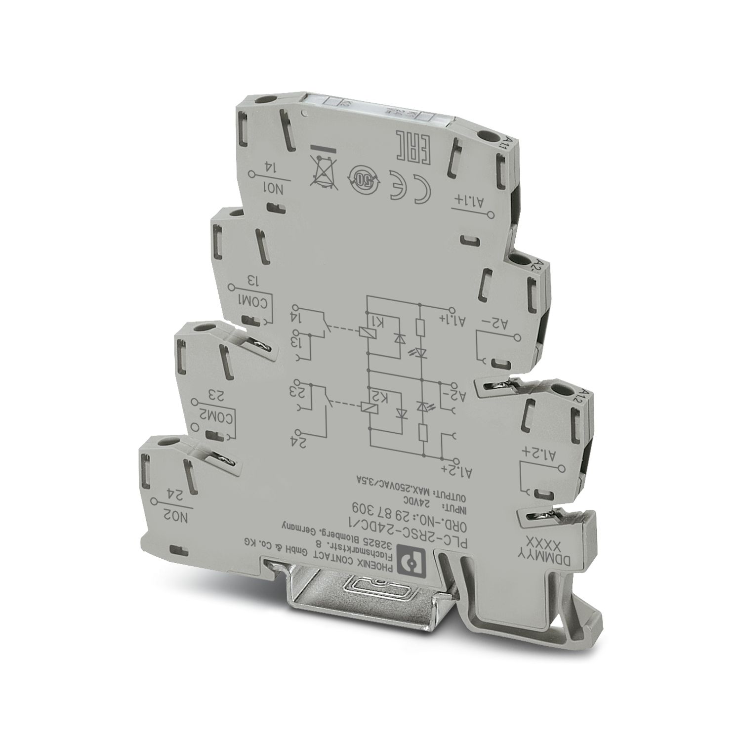 This is manufactured by Phoenix Contact. The manufacturer part number is 2987309. The product plc-2rsc, is a highly preferred choice for users. It features plc-interface range. It is a type of relay module accessory. Features 24 v dc supply voltage. It is assigned with possible HTSUS value of 8536.41.0020. The product is rohs3 compliant. The coil voltage of the product is 24vdc. Moreover, it has screw terminal terminal style. In addition, it is reach affected. The product has -20°c ~ 60°c operating temperature range. It holds up to 3.4 kohms coil resistance. It has a coil current of 7 ma. The coil is a non latching type. The product's switching voltage is 250vac, 30vdc - max. This is basically a general purpose. It is shipped in bulk package . It also has a dpst-no (2 form a) contact form. Its typical moisture sensitivity level is 1 (unlimited). The operating time of the product is 4 ms. It has a long 4 weeks standard lead time. It has a contact current rating of 3.5 a. The splendid features of the product include diode, lighted indicator, socket included. The product is available in din rail configuration. While 6 ms is its release time. The product is made from sturdy silver nickel (agni) materials. Moreover, it corresponds to 29873, a base product number of the product. The product is designated with the ear99 code number.