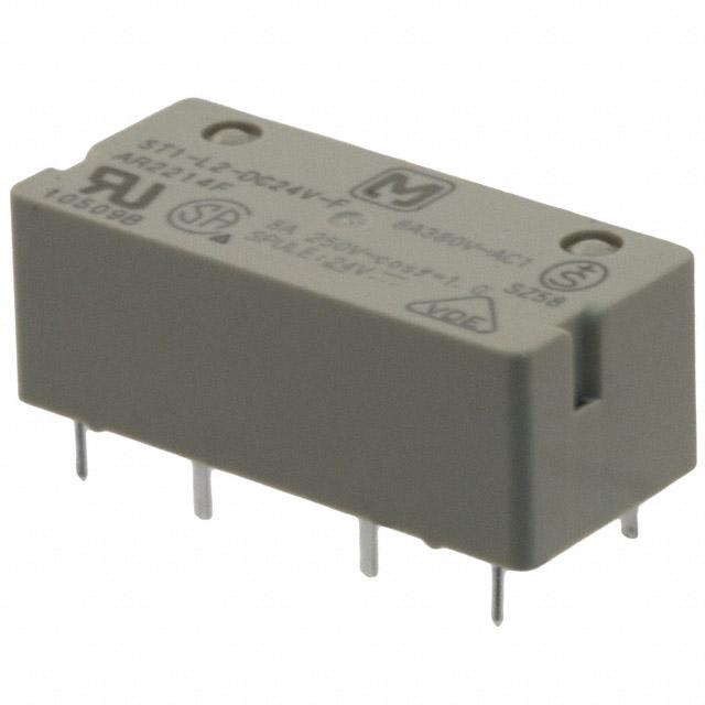 This is manufactured by Panasonic Electric Works. The manufacturer part number is ST1-L2-DC24V-F. It is assigned with possible HTSUS value of 8536.41.0020. The product is rohs3 compliant. The coil voltage of the product is 24vdc. Moreover, it has pc pin terminal style. In addition, it is reach unaffected. The product has -40°c ~ 60°c operating temperature range. It holds up to 2.4 kohms coil resistance. It has a coil current of 10 ma. The coil is a latching, dual coil type. The product's switching voltage is 250vac - max. Seal rating options: sealed - fully. On the other hand, 19.2 vdc is the given crucial/must operating voltage. This is basically a general purpose. It is shipped in box package . It also has a dpst-no/nc (1 form a, 1 form b) contact form. Its typical moisture sensitivity level is 1 (unlimited). The operating time of the product is 15 ms. It has a long 16 weeks standard lead time. It has a contact current rating of 8 a. The product is available in through hole configuration. The product st, is a highly preferred choice for users. While 15 ms is its release time. The product is made from sturdy silver tin oxide (agsno) materials. Moreover, it corresponds to st1-l2, a base product number of the product. The product is designated with the ear99 code number.
