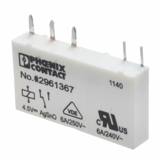 This is manufactured by Phoenix Contact. The manufacturer part number is 2961367. The given dimensions of the product include 5 x 15 x 28mm. The product is available in pcb mount configuration. The contact is equipped with spdt configuration. It has maximum of 4.5v dc of input voltage range. It has about 6a load current rating . Its accurate length is 5mm. It has a 250v ac/dc voltage load rating . In addition, the height is 28mm. The product comes in 15mm depth. 4.5v dc is the maximum voltage of the bespoke product. It has about 38ma input current . Whereas, the minimum operating temperature of the product is -40°c. It has a 5ms turn On time. The given turn off time is 2.5ms. The product has -40 → +85°c of operating temperature range. Moreover, it has approximately 119ω input resistance . It has a maximum operating temperature of 85°c. The terminal is a pcb pin type. The product is made from sturdy silver alloy materials. It is assigned with possible HTSUS value of 8536.41.0020. The product is rohs3 compliant. The coil voltage of the product is 4.5vdc. Moreover, it has pc pin terminal style. In addition, it is reach unaffected. The product has -40°c ~ 85°c operating temperature range. It holds up to 119 ohms coil resistance. It has a coil current of 38 ma. The coil is a non latching type. The product's switching voltage is 250vac, 250vdc - max. This is basically a general purpose. It is shipped in bulk package . It also has a spdt (1 form c) contact form. Its typical moisture sensitivity level is 1 (unlimited). The operating time of the product is 5 ms. It has a long 8 weeks standard lead time. It has a contact current rating of 6 a. The product is available in through hole configuration. The product rel-mr, is a highly preferred choice for users. While 2.5 ms is its release time. The product is made from sturdy silver tin oxide (agsno) materials. Moreover, it corresponds to 29613, a base product number of the product. The product is designated with the ear99 code number.
