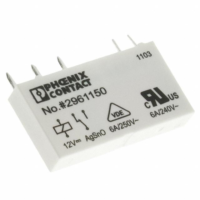 This is manufactured by Phoenix Contact. The manufacturer part number is 2961150. The given dimensions of the product include 5 x 15 x 28mm. The coil voltage of the product is 12v dc. Furthermore, the product is 5mm wide. It holds up to 848 ± 10% o coil resistance. It is capable of doing 2 x 10^7 cycle in a lifetime . While it carries 250v of maximum DC switching voltage. It has a maximum operating temperature of +85°c. The terminal is a pcb pin type. It has a maximum 2 a switching current AC . It is integrated with 6a switching current. The contact is equipped with spdt configuration. The product comes in 15mm depth. The product is available in pcb mount configuration. The product rel-mr- 12dc/21, is a highly preferred choice for users. Its accurate length is 5mm. In addition, the height is 28mm. It has a minimum 2 a DC switching current . It has a maximum AC switching voltage of 250v. Whereas, the minimum operating temperature of the product is -40°c. It has equipped with 1 poles. The product is made from sturdy silver alloy materials. It is assigned with possible HTSUS value of 8536.41.0020. The product is rohs3 compliant. The coil voltage of the product is 12vdc. Moreover, it has pc pin terminal style. In addition, it is reach unaffected. The product has -40°c ~ 85°c operating temperature range. It is approved by culus, eac, ur. It holds up to 848 ohms coil resistance. It has a coil current of 14 ma. The coil is a non latching type. The product's switching voltage is 250vac, 250vdc - max. This is basically a general purpose. It also has a spdt (1 form c) contact form. Its typical moisture sensitivity level is 1 (unlimited). The operating time of the product is 5 ms. It has a long 8 weeks standard lead time. It has a contact current rating of 6 a. The product is available in through hole configuration. The product rel-mr, is a highly preferred choice for users. While 2.5 ms is its release time. In addition, bulk is the available packaging type of the product. The product is made from sturdy silver tin oxide (agsno) materials. Moreover, it corresponds to 29611, a base product number of the product. The product is designated with the ear99 code number.