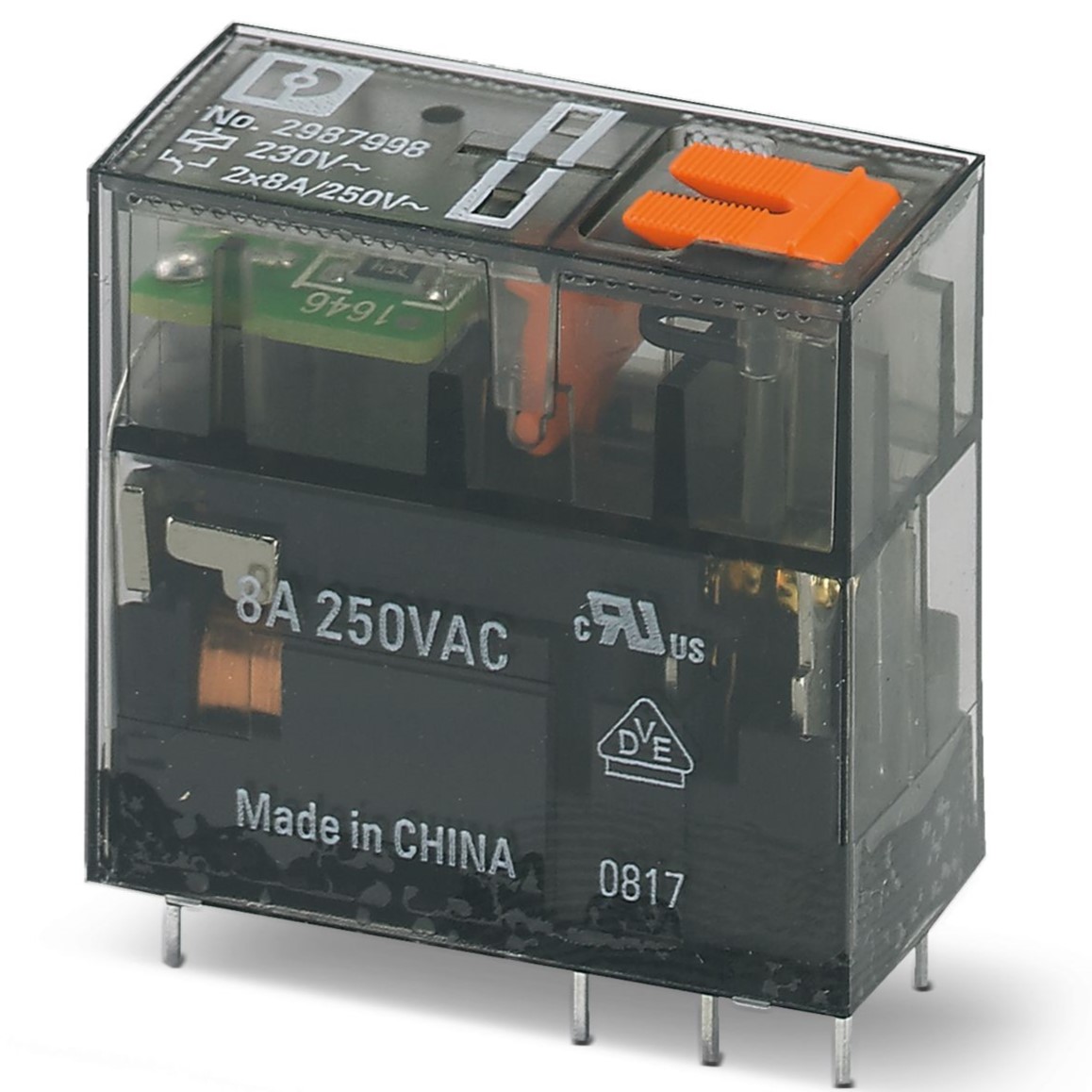 This is manufactured by Phoenix Contact. The manufacturer part number is 2987998. It is capable of doing 5000000 cycles in a lifetime . Whereas, the minimum operating temperature of the product is -40°c. The product is available in plug in configuration. The product rel-mr-230ac/21-21au/ms, is a highly preferred choice for users. Latching Options - no. The coil voltage of the product is 230v ac. The product comes in 25mm depth. In addition, the height is 29mm. Its accurate length is 12.7mm. The contact is equipped with dpdt configuration. It has equipped with 2 poles. It has a maximum operating temperature of +70°c. The product is made from sturdy gold plated materials. It is assigned with possible HTSUS value of 8536.49.0050. The product is rohs compliant. The coil voltage of the product is 230vac. Moreover, it has pc pin terminal style. The product has -40°c ~ 70°c operating temperature range. It holds up to 65.71 kohms coil resistance. It has a coil current of 3.5 ma. The coil is a non latching type. The product's switching voltage is 250vac, 250vdc - max. This is basically a general purpose. It is shipped in bulk package . It also has a dpdt (2 form c) contact form. Its typical moisture sensitivity level is 1 (unlimited). The operating time of the product is 12 ms. It has a long 4 weeks standard lead time. It has a contact current rating of 8 a. The splendid features of the product include diode, lighted indicator, mechanical indicator, test button. The product is available in through hole configuration. The product rel-mr, is a highly preferred choice for users. While 8 ms is its release time. The product is made from sturdy silver nickel (agni), gold (au) materials. Moreover, it corresponds to 29879, a base product number of the product. The product is designated with the ear99 code number.