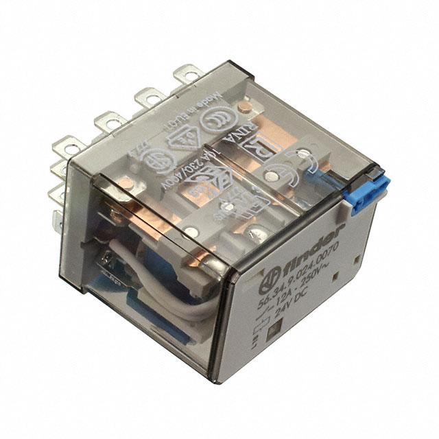 This is manufactured by Finder Relays, Inc.. The manufacturer part number is 56.34.9.024.0070. While the must release voltage is a 4.8 vdc. It is assigned with possible HTSUS value of 8536.41.0050. The product is rohs3 compliant. The coil voltage of the product is 24vdc. Moreover, it has plug in, quick connect - 0.187" (4.7mm) terminal style. In addition, it is reach unaffected. The product has -40°c ~ 70°c operating temperature range. It is approved by ccc, ce, csa, curus, eac, enec, rina, ukca, vde. It holds up to 490 ohms coil resistance. It has a coil current of 49 ma. The coil is a non latching type. The product's switching voltage is 400vac - max. On the other hand, 19.2 vdc is the given crucial/must operating voltage. This is basically a general purpose. It is shipped in bulk package . It also has a 4pdt (4 form c) contact form. Its typical moisture sensitivity level is not applicable. The operating time of the product is 11 ms. It has a long 6 weeks standard lead time. It has a contact current rating of 12 a. The splendid features of the product include lighted indicator, test button. The product is available in socketable configuration. The product 56, is a highly preferred choice for users. While 11 ms is its release time. The product is made from sturdy silver nickel (agni) materials. Moreover, it corresponds to 56.34.9, a base product number of the product. The product is designated with the ear99 code number.