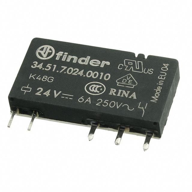 This is manufactured by Finder Relays, Inc.. The manufacturer part number is 34.51.7.024.0010. It is assigned with possible HTSUS value of 8536.41.0020. The product is rohs3 compliant. The coil voltage of the product is 24vdc. Moreover, it has pc pin terminal style. In addition, it is reach unaffected. The product has -40°c ~ 85°c operating temperature range. It is approved by ccc, curus, rina, vde. It holds up to 3.35 kohms coil resistance. It has a coil current of 7.1 ma. The coil is a non latching type. The product's switching voltage is 400vac - max. Seal rating options: sealed - flux protection. On the other hand, 16.8 vdc is the given crucial/must operating voltage. This is basically a general purpose. It is shipped in tube package . It also has a spdt (1 form c) contact form. Its typical moisture sensitivity level is not applicable. The operating time of the product is 5 ms. It has a long 6 weeks standard lead time. It has a contact current rating of 6 a. The product is available in through hole configuration. The product 34, is a highly preferred choice for users. While 3 ms is its release time. The product is made from sturdy silver nickel (agni) materials. Moreover, it corresponds to 34.51.7, a base product number of the product. The product is designated with the ear99 code number.