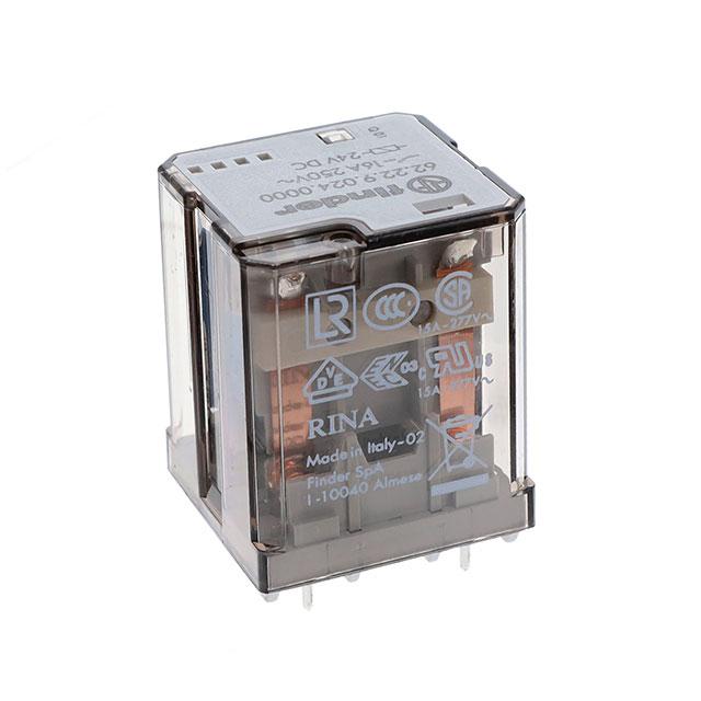 This is manufactured by Finder Relays, Inc.. The manufacturer part number is 62.22.9.024.0000. While the must release voltage is a 4.8 vdc. It is assigned with possible HTSUS value of 8536.41.0050. The product is rohs3 compliant. The coil voltage of the product is 24vdc. Moreover, it has pc pin terminal style. In addition, it is reach unaffected. The product has -40°c ~ 70°c operating temperature range. It is approved by ccc, csa, curus, eac, enec, rina, vde. It holds up to 445 ohms coil resistance. It has a coil current of 54 ma. The coil is a non latching type. The product's switching voltage is 400vac - max. On the other hand, 19.2 vdc is the given crucial/must operating voltage. This is basically a general purpose. It also has a dpdt (2 form c) contact form. Its typical moisture sensitivity level is not applicable. The operating time of the product is 11 ms. It has a contact current rating of 16 a. The product is available in through hole configuration. The product 62, is a highly preferred choice for users. While 4 ms is its release time. In addition, bulk is the available packaging type of the product. The product is made from sturdy silver cadmium oxide (agcdo) materials. Moreover, it corresponds to 62.22.9, a base product number of the product. The product is designated with the ear99 code number.