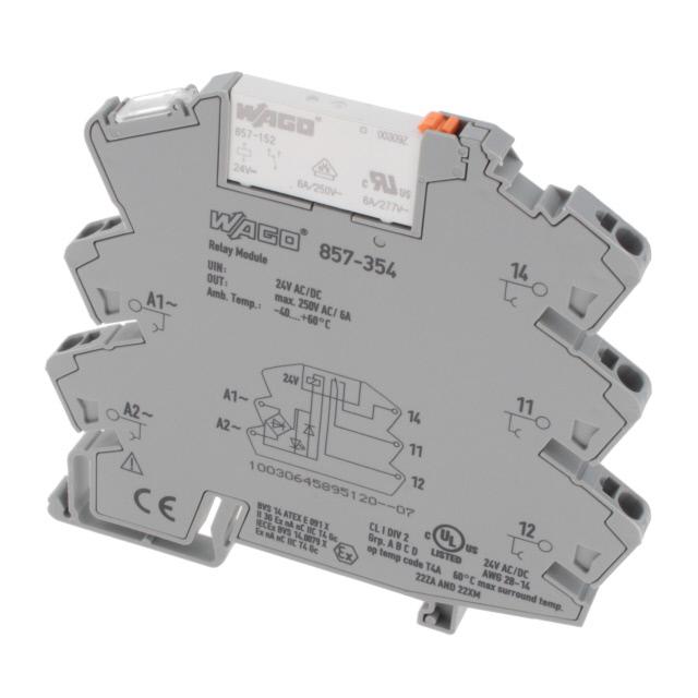 This is manufactured by WAGO Corporation. The manufacturer part number is 857-354. It is assigned with possible HTSUS value of 8536.41.0020. The product is rohs3 compliant. The coil voltage of the product is 24vac/dc. Moreover, it has spring terminal terminal style. In addition, it is reach affected. The product has -40°c ~ 60°c operating temperature range. It is approved by eac, ul. It holds up to 2.8 kohms coil resistance. It has a coil current of 8.5 ma. The coil is a non latching type. The product's switching voltage is 250vac - max. On the other hand, 20.4 vac/dc is the given crucial/must operating voltage. This is basically a general purpose. It also has a spdt (1 form c) contact form. Its typical moisture sensitivity level is 1 (unlimited). The operating time of the product is 15 ms. It has a long 8 weeks standard lead time. It has a contact current rating of 6 a. The splendid features of the product include lighted indicator. The product is available in din rail configuration. The product 857, is a highly preferred choice for users. While 25 ms is its release time. In addition, bulk is the available packaging type of the product. The product is made from sturdy silver tin oxide (agsno) materials. Moreover, it corresponds to 857, a base product number of the product. The product is designated with the ear99 code number.