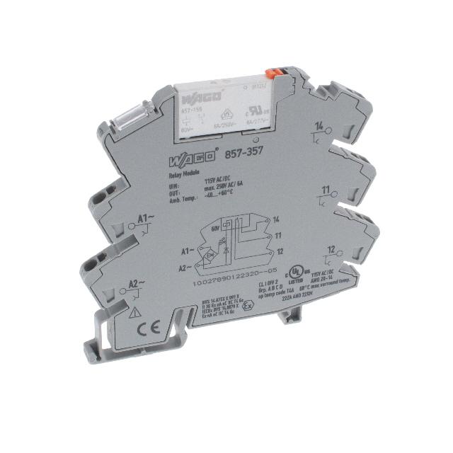This is manufactured by WAGO Corporation. The manufacturer part number is 857-357. It is assigned with possible HTSUS value of 8536.49.0050. The product is rohs3 compliant. The coil voltage of the product is 115vac/dc. Moreover, it has spring terminal terminal style. In addition, it is reach affected. The product has -40°c ~ 60°c operating temperature range. It is approved by eac, ul. It holds up to 28.8 kohms coil resistance. It has a coil current of 4 ma. The coil is a non latching type. The product's switching voltage is 250vac - max. On the other hand, 92 vac/dc is the given crucial/must operating voltage. This is basically a general purpose. It also has a spdt (1 form c) contact form. Its typical moisture sensitivity level is 1 (unlimited). The operating time of the product is 15 ms. It has a long 8 weeks standard lead time. It has a contact current rating of 6 a. The splendid features of the product include lighted indicator. The product is available in din rail configuration. The product 857, is a highly preferred choice for users. While 25 ms is its release time. In addition, bulk is the available packaging type of the product. The product is made from sturdy silver tin oxide (agsno) materials. Moreover, it corresponds to 857, a base product number of the product. The product is designated with the ear99 code number.