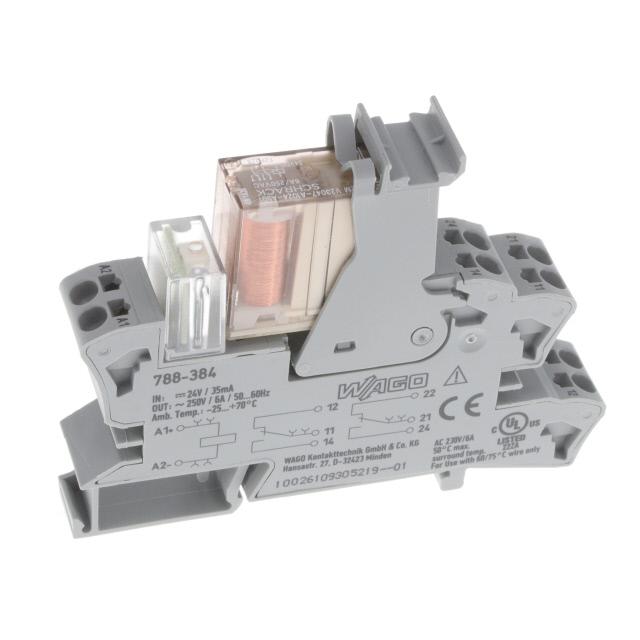 This is manufactured by WAGO Corporation. The manufacturer part number is 788-384. It is assigned with possible HTSUS value of 8536.41.0020. The product is rohs3 compliant. The coil voltage of the product is 24vdc. Moreover, it has spring terminal terminal style. In addition, it is reach unaffected. The product has -40°c ~ 70°c operating temperature range. It holds up to 774.2 ohms coil resistance. It has a coil current of 31 ma. The coil is a non latching type. The product's switching voltage is 250vac - max. On the other hand, 20.4 vdc is the given crucial/must operating voltage. This is basically a general purpose. It also has a dpdt (2 form c) contact form. Its typical moisture sensitivity level is 1 (unlimited). The operating time of the product is 10 ms. It has a long 8 weeks standard lead time. It has a contact current rating of 6 a. The splendid features of the product include lighted indicator. The product is available in din rail configuration. The product 788, is a highly preferred choice for users. While 4 ms is its release time. In addition, bulk is the available packaging type of the product. The product is made from sturdy silver nickel (agni) materials. Moreover, it corresponds to 788, a base product number of the product. The product is designated with the ear99 code number.