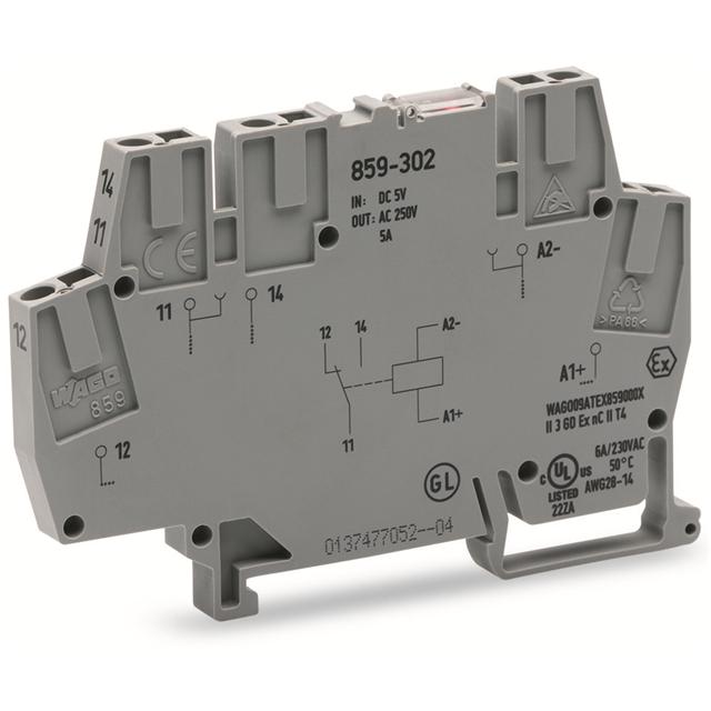 This is manufactured by WAGO Corporation. The manufacturer part number is 859-303. It is assigned with possible HTSUS value of 8536.41.0020. The product is rohs3 compliant. The coil voltage of the product is 12vdc. Moreover, it has spring terminal terminal style. In addition, it is reach affected. The product has -40°c ~ 50°c operating temperature range. It holds up to 705.88 ohms coil resistance. It has a coil current of 17 ma. The coil is a non latching type. The product's switching voltage is 250vac - max. This is basically a general purpose. It also has a spdt (1 form c) contact form. Its typical moisture sensitivity level is not applicable. The operating time of the product is 15 ms. It has a long 12 weeks standard lead time. It has a contact current rating of 5 a. The splendid features of the product include lighted indicator. The product is available in din rail configuration. The product 859, is a highly preferred choice for users. While 25 ms is its release time. In addition, box is the available packaging type of the product. The product is made from sturdy silver tin oxide (agsno) materials. The product is designated with the ear99 code number.