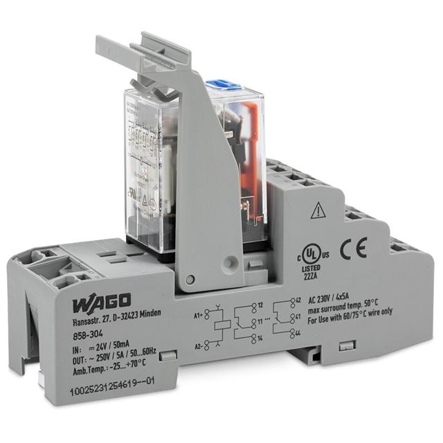 This is manufactured by WAGO Corporation. The manufacturer part number is 858-308. It is assigned with possible HTSUS value of 8536.49.0050. The product is rohs3 compliant. The coil voltage of the product is 220vdc. Moreover, it has spring terminal terminal style. The product has -25°c ~ 70°c operating temperature range. It holds up to 53.66 kohms coil resistance. It has a coil current of 4.1 ma. The coil is a non latching type. The product's switching voltage is 250vac - max. This is basically a general purpose. It is shipped in box package . It also has a 4pdt (4 form c) contact form. Its typical moisture sensitivity level is not applicable. The operating time of the product is 25 ms. It has a long 12 weeks standard lead time. It has a contact current rating of 5 a. The splendid features of the product include lighted indicator. The product is available in din rail configuration. The product 858, is a highly preferred choice for users. While 25 ms is its release time. The product is made from sturdy silver cerium (agce) materials. The product is designated with the ear99 code number.