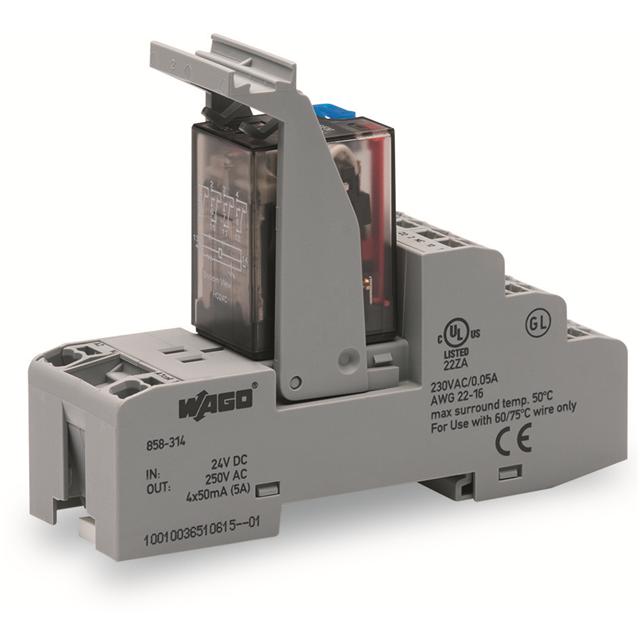This is manufactured by WAGO Corporation. The manufacturer part number is 858-314. It is assigned with possible HTSUS value of 8536.41.0020. The product is rohs3 compliant. The coil voltage of the product is 24vdc. Moreover, it has spring terminal terminal style. The product has -25°c ~ 70°c operating temperature range. It holds up to 650.4 ohms coil resistance. It has a coil current of 36.9 ma. The coil is a non latching type. The product's switching voltage is 250vac - max. This is basically a general purpose. It is shipped in box package . It also has a 4pdt (4 form c) contact form. Its typical moisture sensitivity level is not applicable. The operating time of the product is 25 ms. It has a long 12 weeks standard lead time. It has a contact current rating of 5 a. The splendid features of the product include lighted indicator. The product is available in din rail configuration. The product 858, is a highly preferred choice for users. While 25 ms is its release time. The product is made from sturdy silver cerium (agce), gold (au) materials. The product is designated with the ear99 code number.