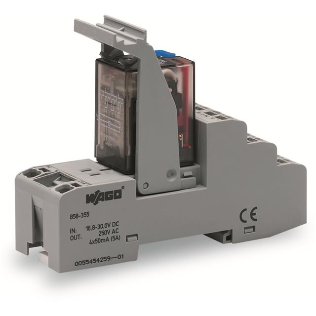 This is manufactured by WAGO Corporation. The manufacturer part number is 858-355. It is assigned with possible HTSUS value of 8536.41.0020. The product is rohs3 compliant. The coil voltage of the product is 24vdc. Moreover, it has spring terminal terminal style. The product has -25°c ~ 70°c operating temperature range. It holds up to 571.43 ohms coil resistance. It has a coil current of 42 ma. The coil is a non latching type. The product's switching voltage is 250vac - max. This is basically a general purpose. It also has a 4pdt (4 form c) contact form. Its typical moisture sensitivity level is not applicable. The operating time of the product is 25 ms. It has a long 12 weeks standard lead time. It has a contact current rating of 5 a. The splendid features of the product include lighted indicator. The product is available in din rail configuration. The product 858, is a highly preferred choice for users. While 25 ms is its release time. In addition, box is the available packaging type of the product. The product is made from sturdy silver cerium (agce), gold (au) materials. The product is designated with the ear99 code number.
