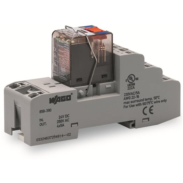 This is manufactured by WAGO Corporation. The manufacturer part number is 858-390. It is assigned with possible HTSUS value of 8536.41.0020. The product is rohs3 compliant. The coil voltage of the product is 24vdc. Moreover, it has screw terminal terminal style. The product has -40° ~ 70°c operating temperature range. It holds up to 761.9 ohms coil resistance. It has a coil current of 31.5 ma. The coil is a non latching type. The product's switching voltage is 250vac - max. This is basically a general purpose. It is shipped in box package . It also has a 4pdt (4 form c) contact form. Its typical moisture sensitivity level is not applicable. The operating time of the product is 15 ms. It has a long 12 weeks standard lead time. It has a contact current rating of 6 a. The splendid features of the product include lighted indicator. The product is available in din rail configuration. The product 858, is a highly preferred choice for users. While 18 ms is its release time. The product is made from sturdy silver nickel (agni) materials. The product is designated with the ear99 code number.