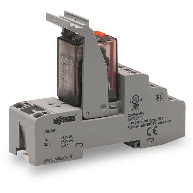 This is manufactured by WAGO Corporation. The manufacturer part number is 858-508. It is assigned with possible HTSUS value of 8536.49.0050. The product is rohs3 compliant. The coil voltage of the product is 230vac. Moreover, it has screw terminal terminal style. The product has -25°c ~ 70°c operating temperature range. It holds up to 27.71 kohms coil resistance. It has a coil current of 8.3 ma. The coil is a non latching type. The product's switching voltage is 250vac - max. This is basically a general purpose. It also has a 4pdt (4 form c) contact form. Its typical moisture sensitivity level is not applicable. The operating time of the product is 25 ms. It has a long 12 weeks standard lead time. It has a contact current rating of 5 a. The splendid features of the product include lighted indicator. The product is available in din rail configuration. The product 858, is a highly preferred choice for users. While 35 ms is its release time. In addition, box is the available packaging type of the product. The product is made from sturdy silver cerium (agce) materials. The product is designated with the ear99 code number.