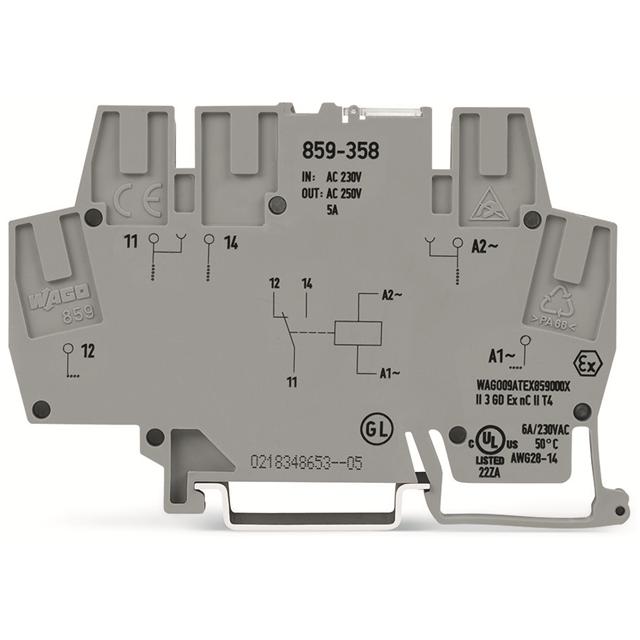 This is manufactured by WAGO Corporation. The manufacturer part number is 859-358. It is assigned with possible HTSUS value of 8536.49.0050. The product is rohs3 compliant. The coil voltage of the product is 230vac/dc. Moreover, it has spring terminal terminal style. The product has -40°c ~ 50°c operating temperature range. It holds up to 65.71 kohms coil resistance. It has a coil current of 3.5 ma. The coil is a non latching type. The product's switching voltage is 250vac - max. This is basically a general purpose. It is shipped in box package . It also has a spdt (1 form c) contact form. Its typical moisture sensitivity level is not applicable. The operating time of the product is 15 ms. It has a long 12 weeks standard lead time. It has a contact current rating of 5 a. The splendid features of the product include lighted indicator. The product is available in din rail configuration. The product 859, is a highly preferred choice for users. While 25 ms is its release time. The product is made from sturdy silver tin oxide (agsno) materials. The product is designated with the ear99 code number.