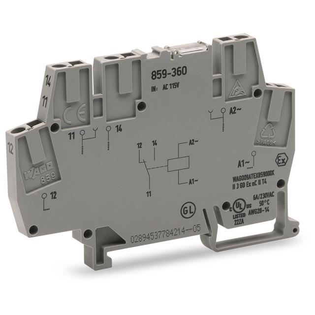 This is manufactured by WAGO Corporation. The manufacturer part number is 859-360. It is assigned with possible HTSUS value of 8536.49.0050. The product is rohs3 compliant. The coil voltage of the product is 115vac/dc. Moreover, it has spring terminal terminal style. The product has -40°c ~ 50°c operating temperature range. It holds up to 32.86 kohms coil resistance. It has a coil current of 3.5 ma. The coil is a non latching type. The product's switching voltage is 250vac - max. This is basically a general purpose. It is shipped in box package . It also has a spdt (1 form c) contact form. Its typical moisture sensitivity level is not applicable. The operating time of the product is 15 ms. It has a long 12 weeks standard lead time. It has a contact current rating of 5 a. The splendid features of the product include lighted indicator. The product is available in din rail configuration. The product 859, is a highly preferred choice for users. While 30 ms is its release time. The product is made from sturdy silver nickel (agni) materials. The product is designated with the ear99 code number.