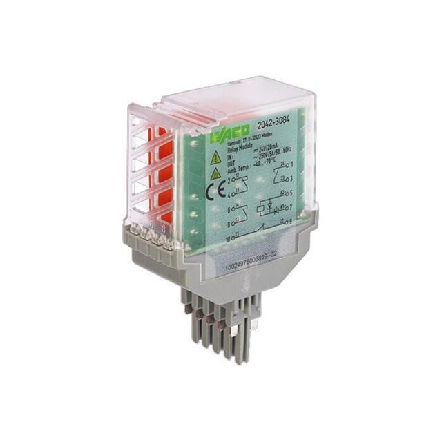 This is manufactured by WAGO Corporation. The manufacturer part number is 2042-3084. It is assigned with possible HTSUS value of 8536.41.0020. The product is rohs3 compliant. The coil voltage of the product is 24vdc. Moreover, it has plug in terminal style. The product has -40° ~ 70°c operating temperature range. It has a coil current of 28.1 ma. The coil is a non latching type. The product's switching voltage is 250vac - max. This is basically a general purpose. It also has a 4pst-2no/2nc (2 form a, 2 form b) contact form. Its typical moisture sensitivity level is not applicable. The operating time of the product is 8 ms. It has a long 12 weeks standard lead time. It has a contact current rating of 5 a. The splendid features of the product include lighted indicator. The product is available in socketable configuration. The product 2042, is a highly preferred choice for users. While 6 ms is its release time. In addition, box is the available packaging type of the product. The product is designated with the ear99 code number. The product is made from sturdy silver nickel (agni) materials.