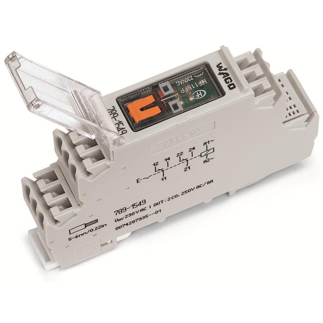 This is manufactured by WAGO Corporation. The manufacturer part number is 789-1549. It is assigned with possible HTSUS value of 8536.49.0050. The product is rohs3 compliant. The coil voltage of the product is 230vac. Moreover, it has spring terminal terminal style. The product has -25°c ~ 50°c operating temperature range. It is approved by eac. It holds up to 65.71 kohms coil resistance. It has a coil current of 3.5 ma. The coil is a non latching type. The product's switching voltage is 250vac - max. This is basically a general purpose. It is shipped in box package . It also has a dpdt (2 form c) contact form. Its typical moisture sensitivity level is not applicable. The operating time of the product is 15 ms. It has a long 12 weeks standard lead time. It has a contact current rating of 8 a. The splendid features of the product include lighted indicator. The product is available in din rail configuration. The product 789, is a highly preferred choice for users. While 8 ms is its release time. The product is made from sturdy silver nickel (agni) materials. The product is designated with the ear99 code number.