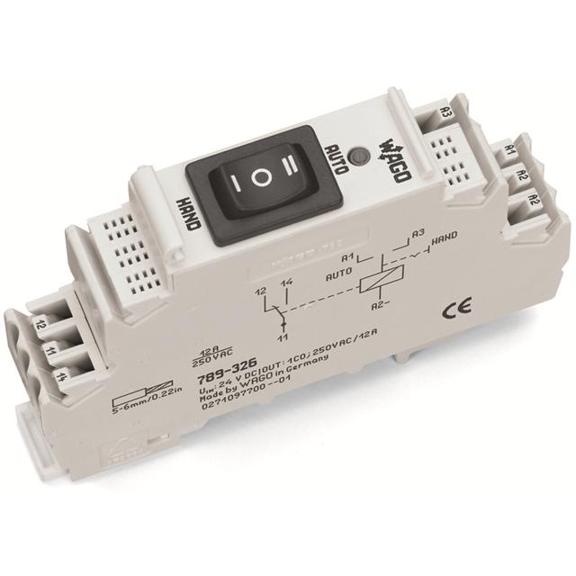 This is manufactured by WAGO Corporation. The manufacturer part number is 789-326. It is assigned with possible HTSUS value of 8536.41.0050. The product is rohs3 compliant. The coil voltage of the product is 24vdc. Moreover, it has spring terminal terminal style. The product has -20°c ~ 40°c operating temperature range. It is approved by eac. It holds up to 1.26 kohms coil resistance. It has a coil current of 19 ma. The coil is a non latching type. The product's switching voltage is 250vac - max. This is basically a general purpose. It is shipped in box package . It also has a spdt (1 form c) contact form. Its typical moisture sensitivity level is not applicable. The operating time of the product is 15 ms. It has a long 12 weeks standard lead time. It has a contact current rating of 12 a. The splendid features of the product include lighted indicator. The product is available in din rail configuration. The product 789, is a highly preferred choice for users. While 5 ms is its release time. The product is made from sturdy silver tin oxide (agsno) materials. The product is designated with the ear99 code number.