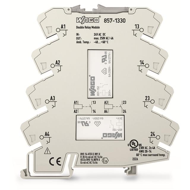 This is manufactured by WAGO Corporation. The manufacturer part number is 857-1330. It is assigned with possible HTSUS value of 8536.41.0020. The product is rohs3 compliant. The coil voltage of the product is 240vac/dc. Moreover, it has spring terminal terminal style. In addition, it is reach affected. The product has -40°c ~ 60°c operating temperature range. It is approved by eac, ul. It holds up to 24 kohms coil resistance. It has a coil current of 10 ma. The coil is a non latching type. The product's switching voltage is 250vac - max. This is basically a general purpose. It also has a spst-no (1 form a) contact form. Its typical moisture sensitivity level is not applicable. The operating time of the product is 15 ms. It has a long 12 weeks standard lead time. It has a contact current rating of 4 a. The product is available in din rail configuration. The product 857, is a highly preferred choice for users. While 25 ms is its release time. In addition, box is the available packaging type of the product. The product is made from sturdy silver tin oxide (agsno) materials. The product is designated with the ear99 code number.