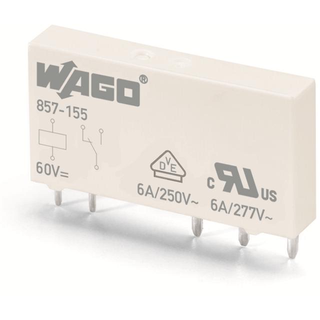 This is manufactured by WAGO Corporation. The manufacturer part number is 857-155. It is assigned with possible HTSUS value of 8536.41.0020. The product is rohs3 compliant. The coil voltage of the product is 60vdc. Moreover, it has pc pin terminal style. In addition, it is reach unaffected. The product has -40°c ~ 85°c operating temperature range. It is approved by ul. The coil is a non latching type. The product's switching voltage is 250vac - max. This is basically a general purpose. It is shipped in box package . It also has a spdt (1 form c) contact form. Its typical moisture sensitivity level is not applicable. The operating time of the product is 8 ms. It has a long 12 weeks standard lead time. It has a contact current rating of 6 a. The product is available in through hole configuration. The product 857, is a highly preferred choice for users. While 4 ms is its release time. The product is made from sturdy silver tin oxide (agsno) materials. The product is designated with the ear99 code number.