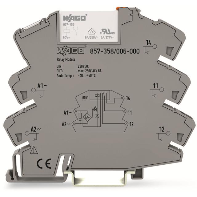This is manufactured by WAGO Corporation. The manufacturer part number is 857-358/006-000. It is assigned with possible HTSUS value of 8536.49.0050. The product is rohs3 compliant. The coil voltage of the product is 230vac. Moreover, it has spring terminal terminal style. The product has -40°c ~ 60°c operating temperature range. It is approved by eac. It holds up to 14.38 kohms coil resistance. It has a coil current of 16 ma. The coil is a non latching type. The product's switching voltage is 250vac - max. This is basically a general purpose. It is shipped in box package . It also has a spdt (1 form c) contact form. Its typical moisture sensitivity level is not applicable. The operating time of the product is 15 ms. It has a long 12 weeks standard lead time. It has a contact current rating of 6 a. The splendid features of the product include lighted indicator. The product is available in din rail configuration. The product 857, is a highly preferred choice for users. While 25 ms is its release time. The product is made from sturdy silver tin oxide (agsno) materials. Moreover, it corresponds to 857-358, a base product number of the product. The product is designated with the ear99 code number.