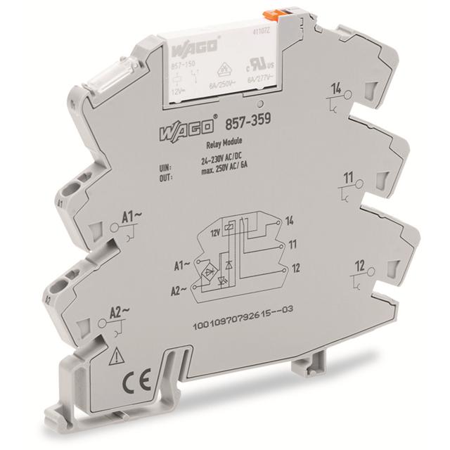 This is manufactured by WAGO Corporation. The manufacturer part number is 857-359. It is assigned with possible HTSUS value of 8536.49.0050. The product is rohs3 compliant. The coil voltage of the product is 24 ~ 230vac/dc. Moreover, it has spring terminal terminal style. In addition, it is reach affected. The product has -25°c ~ 70°c operating temperature range. It is approved by eac, ul. It holds up to 65.71 kohms coil resistance. It has a coil current of 3.5 ma. The coil is a non latching type. The product's switching voltage is 250vac - max. This is basically a general purpose. It is shipped in box package . It also has a spdt (1 form c) contact form. Its typical moisture sensitivity level is not applicable. The operating time of the product is 15 ms. It has a long 12 weeks standard lead time. It has a contact current rating of 6 a. The splendid features of the product include lighted indicator. The product is available in din rail configuration. The product 857, is a highly preferred choice for users. While 25 ms is its release time. The product is made from sturdy silver tin oxide (agsno) materials. The product is designated with the ear99 code number.