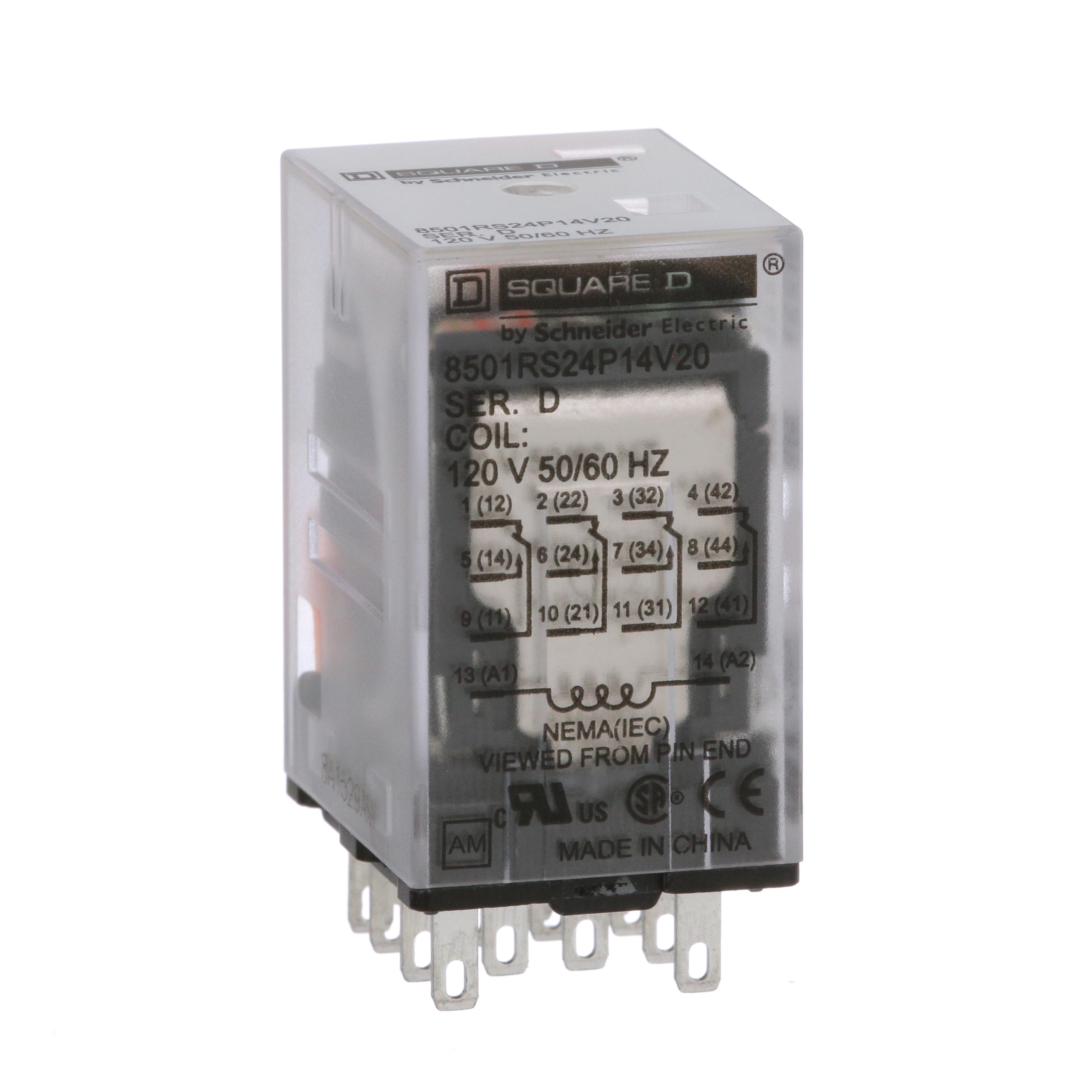 This is manufactured by Schneider Electric. The manufacturer part number is 8501RS24P14V20. It is assigned with possible HTSUS value of 8536.49.0050. The coil voltage of the product is 120vac. Moreover, it has plug in terminal style. The product has -40°c ~ 55°c operating temperature range. The coil is a non latching type. The product's switching voltage is 300vac - max. This is basically a general purpose. It also has a 4pdt (4 form c) contact form. The operating time of the product is 20 ms. It has a contact current rating of 3 a. The product is available in socketable configuration. The product square d 8501r, is a highly preferred choice for users. While 20 ms is its release time. In addition, box is the available packaging type of the product. The product is designated with the ear99 code number. Moreover, it corresponds to 8501rs, a base product number of the product. The product is made from sturdy silver (ag), gold (au) materials.