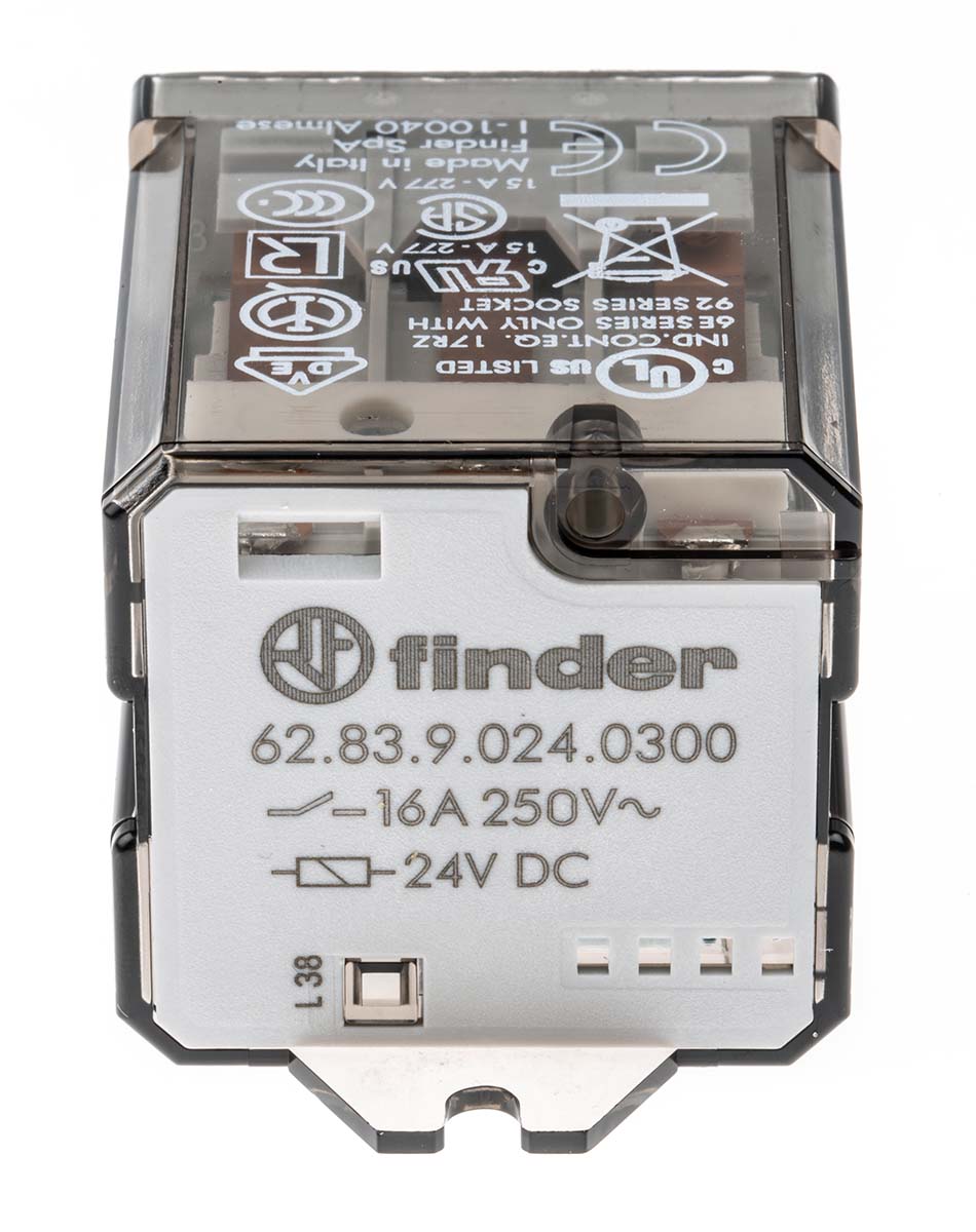This is 3P-NO Non-Latching Relay Flange Mount 24V dc Coil 16 A manufactured by Finder. The manufacturer part number is 62.83.9.024.0300. It has a maximum operating temperature of +50°c. The product is available in flange mount configuration. Robust coil power of 3w. The product 62 series, is a highly preferred choice for users. Latching Options - no. The coil voltage of the product is 24v dc. Its accurate length is 68mm. In addition, the height is 35.8mm. It is integrated with 16a switching current. Applications Information involves power. The product comes in 38.2mm depth. It has a maximum AC switching voltage of 250v ac. Whereas, the minimum operating temperature of the product is -40°c. It also features an AC switching power of 4 kva. The contact is equipped with 3p-no configuration. The product has 6kv isolation coil to contact. The product is made from sturdy silver alloy materials. It has equipped with 3 poles. The terminal is a quick connect type. It holds up to 192ω coil resistance.