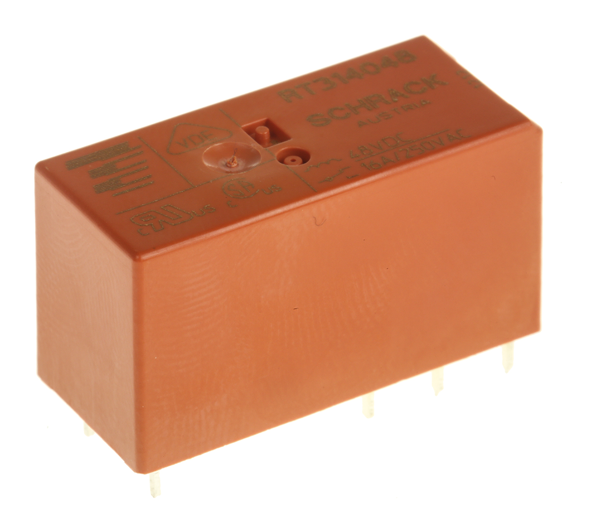 This is SPDT Non-Latching Relay PCB Mount 48V dc Coil 16 A manufactured by TE Connectivity. The manufacturer part number is RT314048. It has a maximum operating temperature of +85°c. The product is available in pcb mount configuration. The product rt1, is a highly preferred choice for users. Latching Options - no. The coil voltage of the product is 48v dc. Its accurate length is 29mm. In addition, the height is 15.7mm. It is integrated with 16a switching current. Applications Information involves power. The product comes in 12.7mm depth. Whereas, the minimum operating temperature of the product is -40°c. The contact is equipped with spdt configuration. It also features an AC switching power of 4 kva. The product is made from sturdy silver nickel alloy materials. It has equipped with 1 poles. The terminal is a through hole type. It holds up to 5520ω coil resistance.