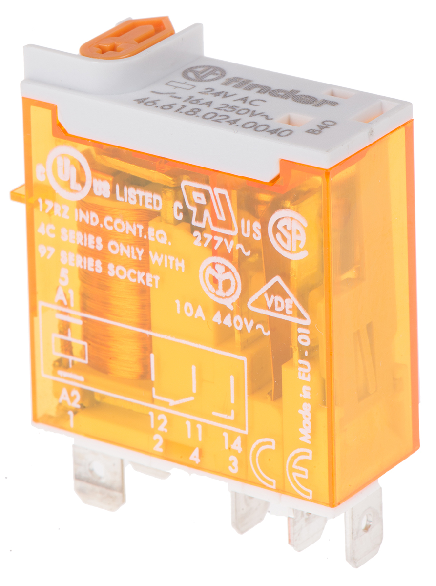 This is SPDT Plug In Non-Latching Relay 24V ac Coil 16 A manufactured by Finder. The manufacturer part number is 46.61.8.024.0040. The given dimensions of the product include 12.4x32.8x29. The coil voltage of the product is 24v ac. Applications Information involves general purpose. The terminal is a quick connect type. It holds up to 320ω coil resistance. It is capable of doing 100000 cycles in a lifetime . Robust coil power of 1.2w. While it carries 16v of maximum DC switching voltage. The product has 6kv isolation coil to contact. It has a maximum operating temperature of +70°c. It is integrated with 16a switching current. Whereas, the minimum operating temperature of the product is -40°c. Latching Options - no. The contact is equipped with spdt configuration. The product comes in 12.4mm depth. The product is available in plug in configuration. The product 46 series, is a highly preferred choice for users. Its accurate length is 29mm. In addition, the height is 32.8mm. It has a maximum AC switching voltage of 250v ac. It also features an AC switching power of 4 kva. It has equipped with 1 poles. The product is made from sturdy silver alloy materials.