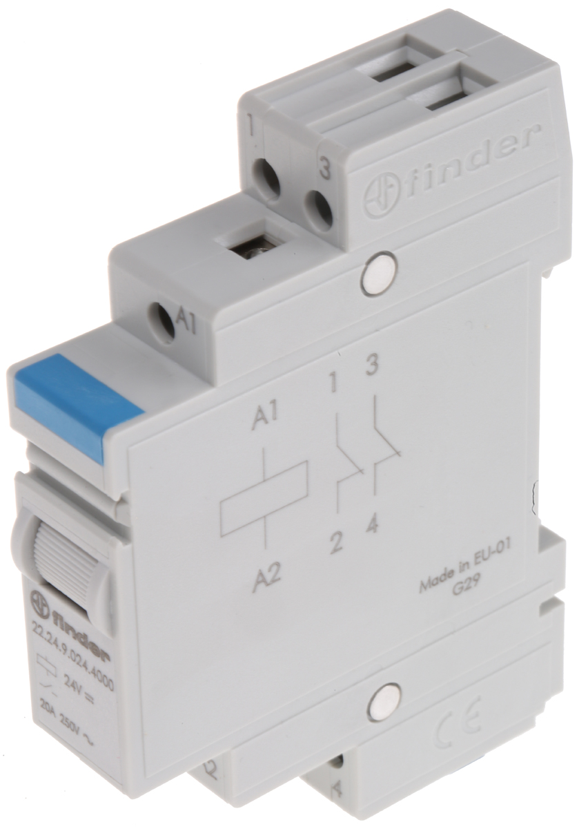This is DPNC Non-Latching Relay DIN Rail 24V dc Coil 20 A manufactured by Finder. The manufacturer part number is 22.24.9.024.4000. It has a maximum operating temperature of +40°c. The product is available in din rail configuration. Robust coil power of 1.25w. The product 22 series, is a highly preferred choice for users. Latching Options - no. The coil voltage of the product is 24v dc. The contact is equipped with 2nc configuration. It is integrated with 20a switching current. The product comes in 58.4mm depth. Whereas, the minimum operating temperature of the product is -40°c. It also features an AC switching power of 5 kva. The product is made from sturdy silver alloy materials. It has equipped with 4 poles. The terminal is a screw type. It holds up to 460ω coil resistance.
