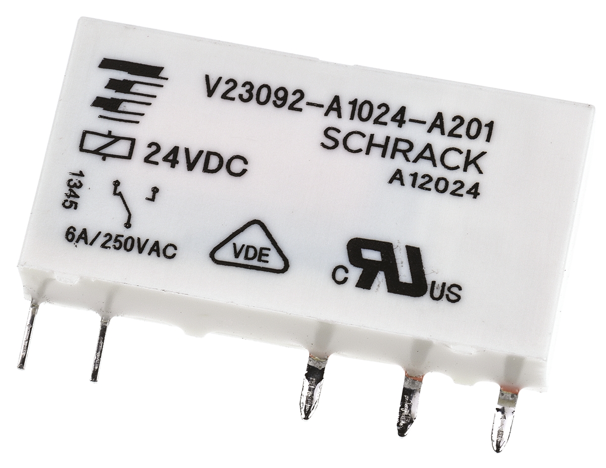 This is SPDT Non-Latching Relay PCB Mount 24V dc Coil 6 A manufactured by TE Connectivity. The manufacturer part number is V23092-A1024-A201. It has a maximum operating temperature of +85°c. The product is available in pcb mount configuration. The product snr, is a highly preferred choice for users. Latching Options - no. The coil voltage of the product is 24v dc. Its accurate length is 28mm. In addition, the height is 15mm. It is integrated with 6a switching current. Applications Information involves pcb. The product comes in 5mm depth. Whereas, the minimum operating temperature of the product is -40°c. The contact is equipped with spdt configuration. It also features an AC switching power of 1.5 kva. The product is made from sturdy gold plated materials. It has equipped with 1 poles. The terminal is a through hole type. It holds up to 3390ω coil resistance.