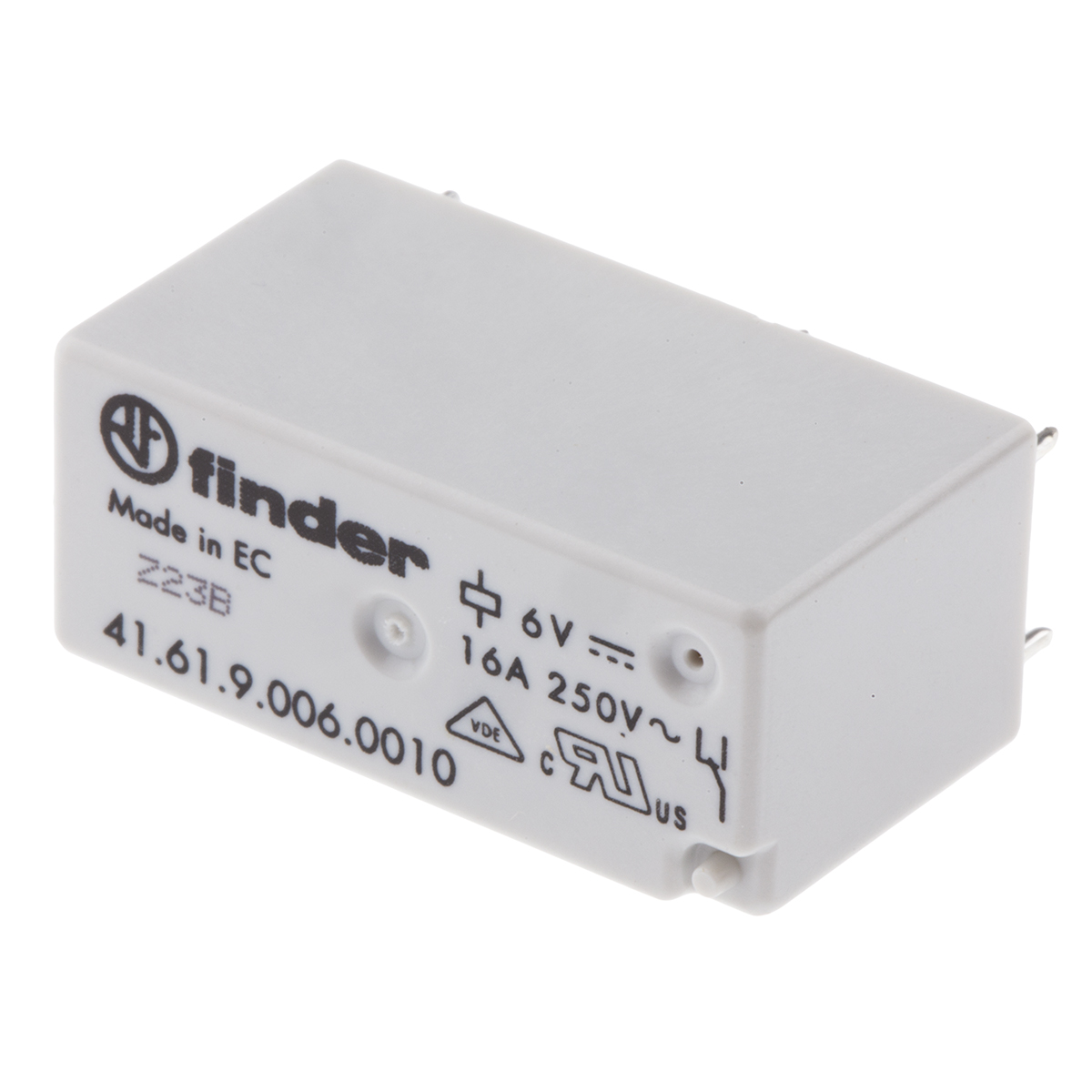 This is SPDT PCB Mount Non-Latching Relay 6V dc Coil manufactured by Finder. The manufacturer part number is 41.61.9.006.0010. It is capable of doing 30000000 (dc mechanical) cycles, 70000 (electrical) cycles in a lifetime . It has a maximum operating temperature of +85°c. The product is available in pcb mount configuration. Robust coil power of 400mw. The product 41 series, is a highly preferred choice for users. Latching Options - no. The coil voltage of the product is 6v dc. The product comes in 12.5mm depth. In addition, the height is 15.7mm. It is integrated with 16a switching current. Its accurate length is 29mm. It has a maximum AC switching voltage of 400v ac. Whereas, the minimum operating temperature of the product is -40°c. It also features an AC switching power of 4 kva. The contact is equipped with spdt configuration. The product has 6kv isolation coil to contact. The product is made from sturdy silver alloy materials. It has equipped with 1 poles. The terminal is a through hole type. It holds up to 90ω coil resistance.