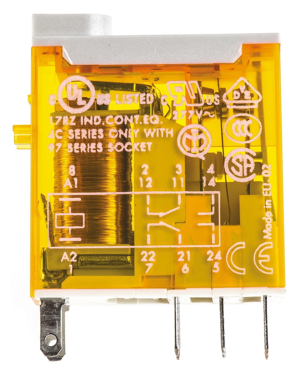 This is DPDT Plug In Non-Latching Relay 24V ac Coil 8 A manufactured by Finder. The manufacturer part number is 46.52.8.024.0040. The coil voltage of the product is 24v ac. Applications Information involves general purpose. The terminal is a quick connect type. It holds up to 320ω coil resistance. It is capable of doing 100000 cycles in a lifetime . Robust coil power of 1.2w. While it carries 15v dc of maximum DC switching voltage. The product has 6kv isolation coil to contact. It has a maximum operating temperature of +70°c. It is integrated with 8a switching current. Whereas, the minimum operating temperature of the product is -40°c. Latching Options - no. The contact is equipped with dpdt configuration. The product comes in 12.4mm depth. The product is available in plug in configuration. The product 46 series, is a highly preferred choice for users. Its accurate length is 29mm. In addition, the height is 32.8mm. It has a maximum AC switching voltage of 250v ac. It also features an AC switching power of 2 kva. It has equipped with 2 poles. The product is made from sturdy silver alloy materials.