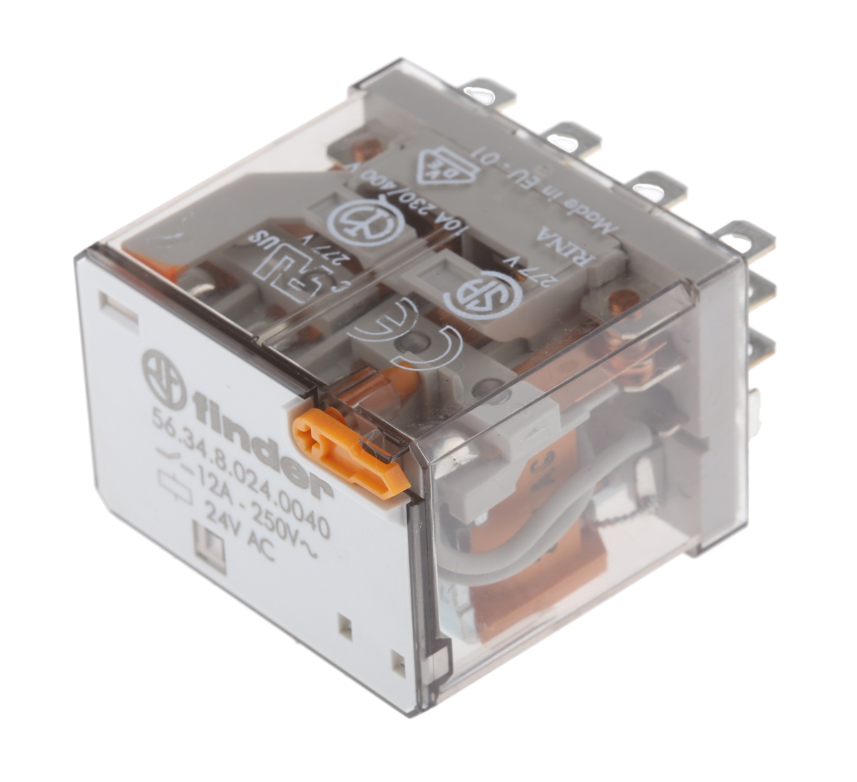 This is 4PDT Non-Latching Relay Plug In 24V ac Coil 12 A manufactured by Finder. The manufacturer part number is 56.34.8.024.0040. The coil voltage of the product is 24v ac. It consists of single coils. Applications Information involves general purpose. The terminal is a quick connect type. It holds up to 81ω coil resistance. It is capable of doing 100000 cycles in a lifetime . The product complies with all safety standards, such as curus, eac. Robust coil power of 1w. While it carries 220v dc of maximum DC switching voltage. The product has 5kv isolation coil to contact. It has a maximum operating temperature of +70°c. It is integrated with 12a switching current. It has a maximum 20 a switching current AC . Whereas, the minimum operating temperature of the product is -40°c. Latching Options - no. The contact is equipped with 4pdt configuration. The product comes in 40.8mm depth. The product is available in plug in configuration. The product 56 series, is a highly preferred choice for users. Its accurate length is 27.7mm. In addition, the height is 37.1mm. It has a maximum AC switching voltage of 400v ac. It also features an AC switching power of 3 kva. It has equipped with 4 poles. The product is made from sturdy silver alloy materials.