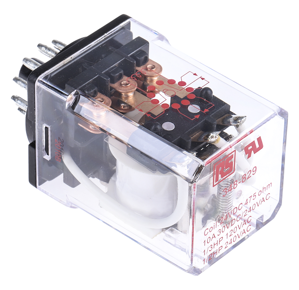 This is 3PDT Non-Latching Relay Plug In 24V dc Coil 10 A General Purpose Relay manufactured by RS Pro. The manufacturer part number is 348-829. The coil voltage of the product is 24v dc. Applications Information involves power. The terminal is a through hole type. It holds up to 478ω coil resistance. It is capable of doing 10000000 (mechanical) cycles in a lifetime . The product complies with all safety standards, such as cur e125370, ul e125370. Robust coil power of 1.2w. While it carries 30v dc of maximum DC switching voltage. It bears a maximum 300 w of DC switching power. The product has 1.5kv ac isolation coil to contact. It has a maximum operating temperature of +65°c. It is integrated with 10a switching current. Latching Options - no. The contact is equipped with 3pdt configuration. The product comes in 35mm depth. The product is available in plug in configuration. Its accurate length is 35mm. In addition, the height is 56mm. It has a maximum AC switching voltage of 240v ac. Whereas, the minimum operating temperature of the product is -45°c. It also features an AC switching power of 2.4 kva. It has equipped with 3 poles. The product is made from sturdy silver alloy materials.