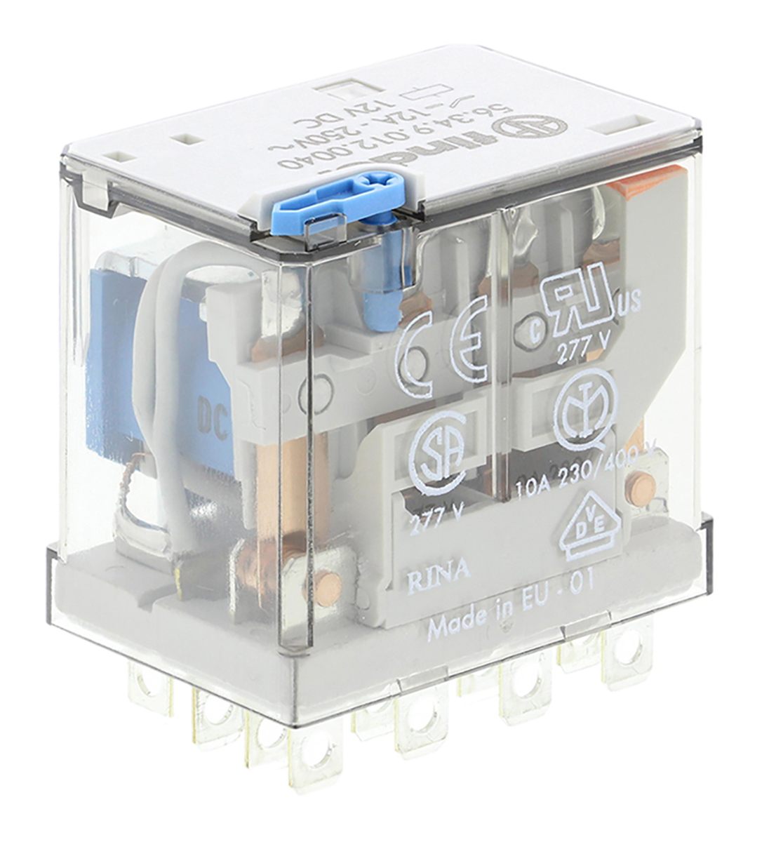 This is 4PDT Non-Latching Relay Plug In 12V dc Coil 12 A manufactured by Finder. The manufacturer part number is 56.34.9.012.0040. The coil voltage of the product is 12v dc. It consists of single coils. Applications Information involves power. The terminal is a quick connect type. It holds up to 123ω coil resistance. It is capable of doing 100000 cycles in a lifetime . The product complies with all safety standards, such as curus, eac. Robust coil power of 1w. While it carries 220v dc of maximum DC switching voltage. The product has 5kv isolation coil to contact. It has a maximum operating temperature of +70°c. It is integrated with 12a switching current. It has a maximum 20 a switching current AC . Whereas, the minimum operating temperature of the product is -40°c. Latching Options - no. The contact is equipped with 4pdt configuration. The product comes in 40.8mm depth. The product is available in plug in configuration. The product 56 series, is a highly preferred choice for users. Its accurate length is 27.7mm. In addition, the height is 37.1mm. It has a maximum AC switching voltage of 400v ac. It also features an AC switching power of 3 kva. It has equipped with 4 poles. The product is made from sturdy silver alloy materials.