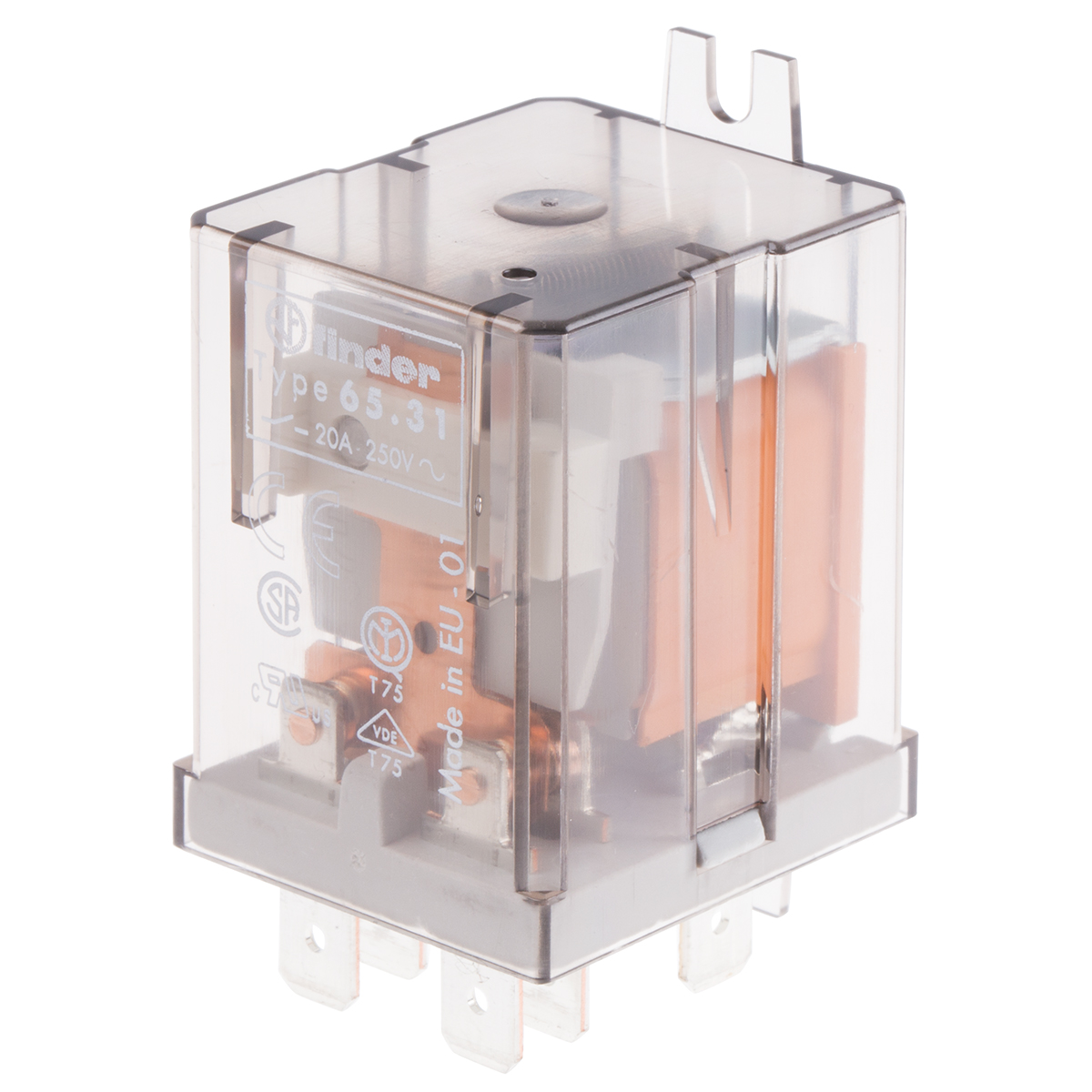 This is SPDT Non-Latching Relay Flange Mount 110V ac Coil 20 A manufactured by Finder. The manufacturer part number is 65.31.8.110.0000. It has a maximum operating temperature of +75°c. The product is available in flange mount configuration. Robust coil power of 2.2w. The product 65 series, is a highly preferred choice for users. Latching Options - no. The coil voltage of the product is 110v ac. Its accurate length is 62.2mm. In addition, the height is 36.5mm. It is integrated with 20a switching current. Applications Information involves power. The product comes in 32.2mm depth. It has a maximum AC switching voltage of 250v ac. Whereas, the minimum operating temperature of the product is -40°c. It also features an AC switching power of 5 kva. The contact is equipped with spdt configuration. The product has 4kv isolation coil to contact. The product is made from sturdy silver alloy materials. It has equipped with 1 poles. The terminal is a quick connect type. It holds up to 1600ω coil resistance.