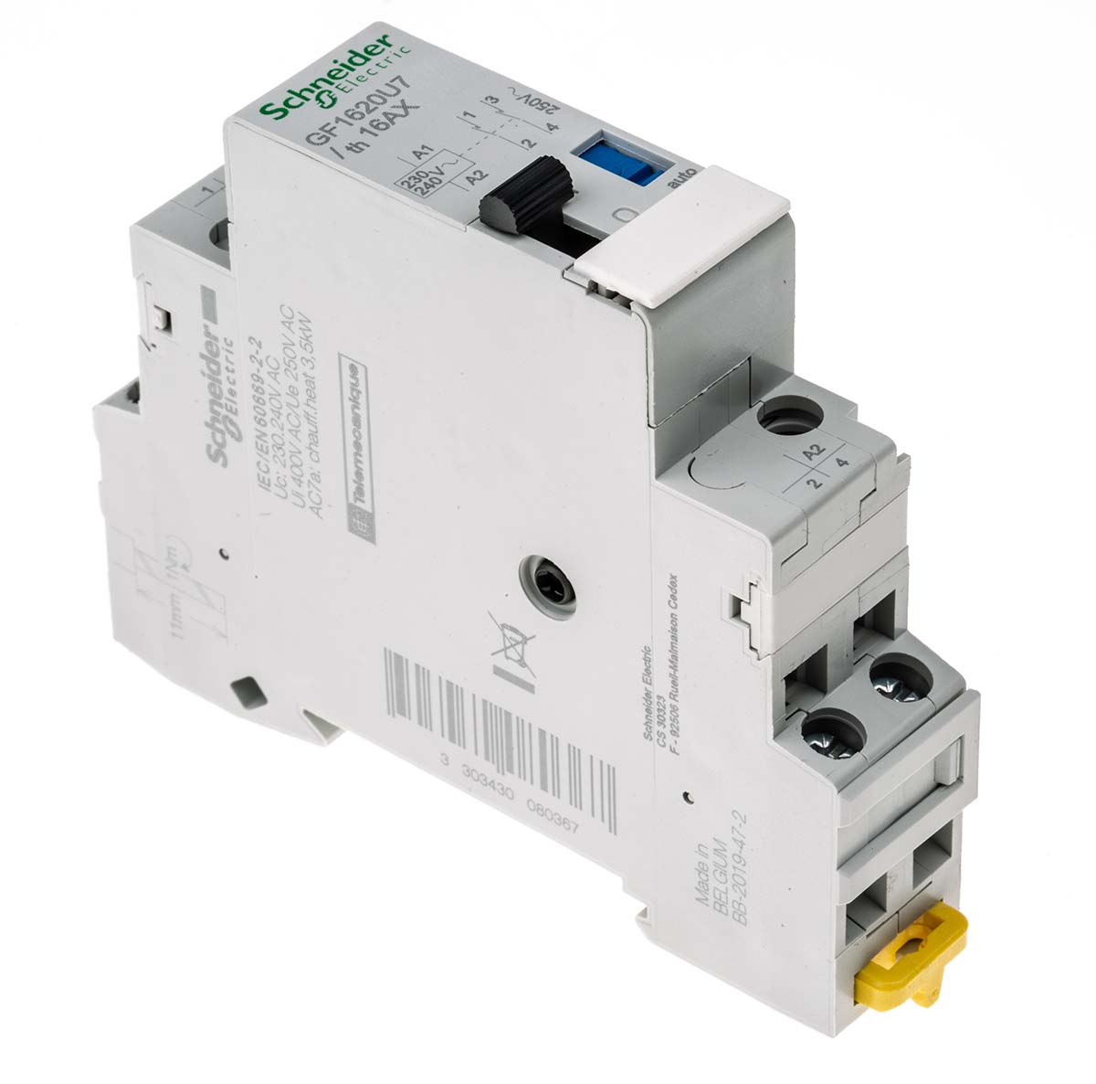 This is 2P Impulse Relay with NO Contacts 16 A 110 V dc 230 → 240 V ac Coil manufactured by Schneider Electric. The manufacturer part number is GF1620U7. Better World Verification Options - green premium. Is it a better world product? yes. The product is available in din rail configuration. It is integrated with 16a switching current. The coil voltage of the product is 230 → 240v ac. The contact is equipped with spst configuration. It has equipped with 2 poles.