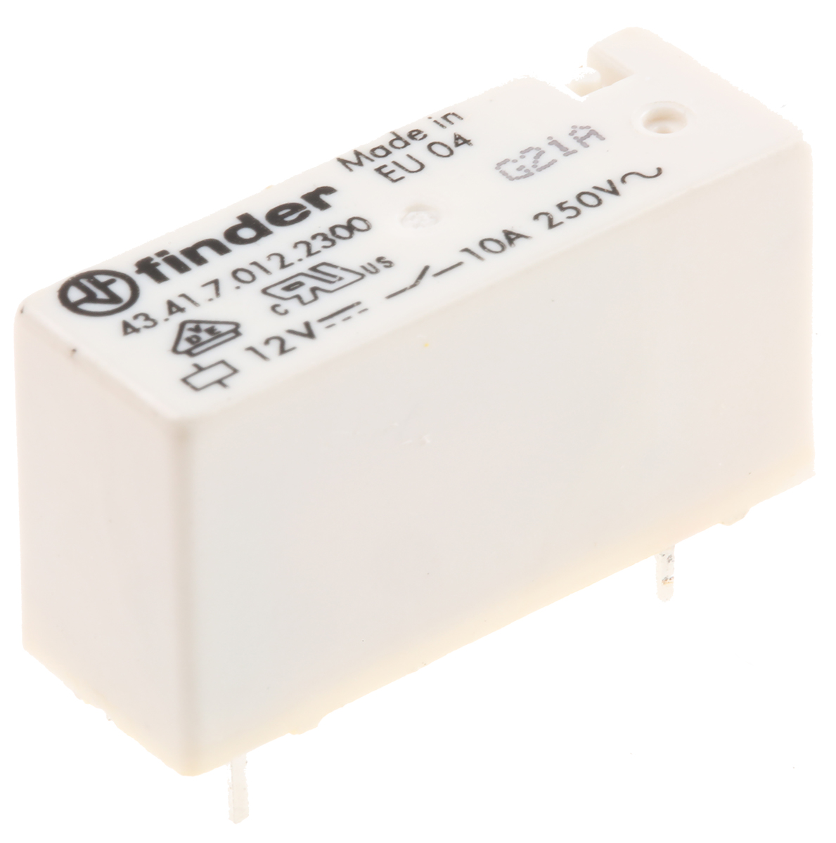 This is SPNO Non-Latching Relay PCB Mount 12V dc Coil 10 A manufactured by Finder. The manufacturer part number is 43.41.7.012.2300. It is capable of doing 100000 (electrical) cycles, 10000000 (mechanical) cycles in a lifetime . It has a maximum operating temperature of +85°c. The product is available in pcb mount configuration. Robust coil power of 250mw. The product 43 series, is a highly preferred choice for users. Latching Options - no. The coil voltage of the product is 12v dc. The product comes in 10.2mm depth. In addition, the height is 15.4mm. It is integrated with 10a switching current. Its accurate length is 30.2mm. It has a maximum AC switching voltage of 400v ac. Whereas, the minimum operating temperature of the product is -40°c. It also features an AC switching power of 2.5 kva. The contact is equipped with spst configuration. The product has 6kv isolation coil to contact. The product is made from sturdy silver alloy materials. It has equipped with 1 poles. The terminal is a through hole type. It holds up to 580ω coil resistance.