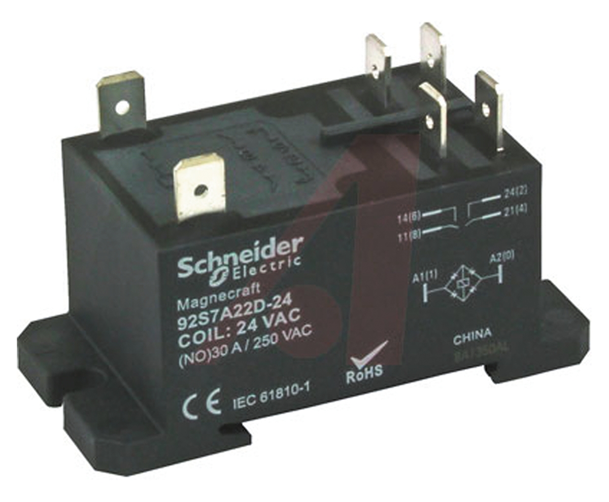 This is DPNO Panel Mount Non-Latching Relay 24V ac Coil 20 A manufactured by Schneider Electric. The manufacturer part number is 92S7A22D-24. It is capable of doing 100000 cycles in a lifetime . The product is available in panel mount configuration. Robust coil power of 4w. It has a maximum operating temperature of +55°c. Latching Options - no. The coil voltage of the product is 24v ac. The product comes in 52mm depth. In addition, the height is 30mm. It is integrated with 20a switching current. Applications Information involves power. Its accurate length is 33.7mm. It has a maximum AC switching voltage of 300v. Whereas, the minimum operating temperature of the product is -40°c. The contact is equipped with dpst configuration. The product has 4kv ac isolation coil to contact. The product is made from sturdy silver alloy materials. It has equipped with 2 poles. The terminal is a quick connect type. It holds up to 170ω coil resistance.