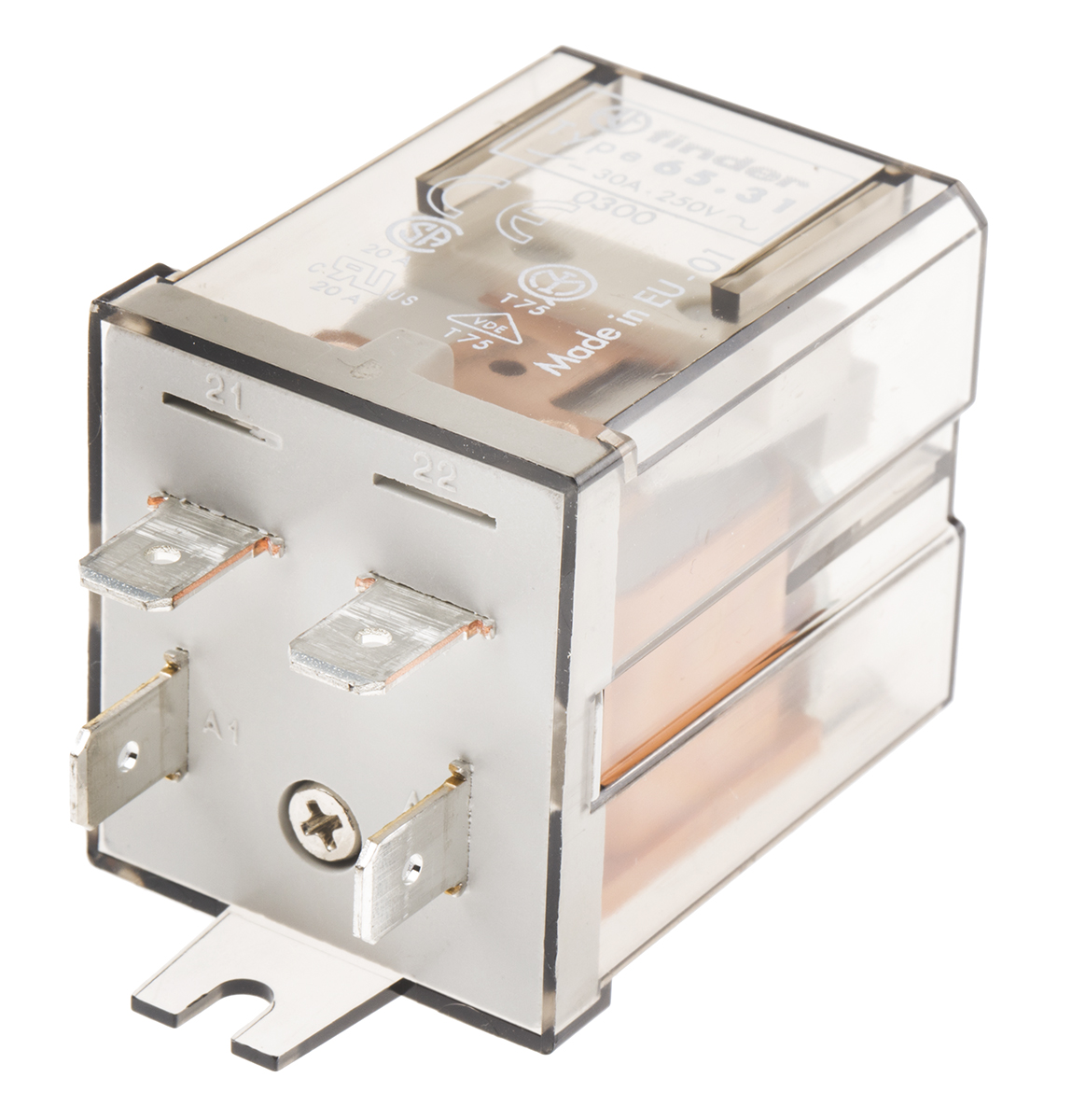 This is 30A SPNO industrial power relay 24Vac manufactured by Finder. The manufacturer part number is 65.31.8.024.0300. The given dimensions of the product include 32.2 x 36.5 x 51.5mm. The product is available in flange mount configuration. Robust coil power of 2.2w. It has a maximum operating temperature of +75°c. The coil voltage of the product is 24v ac. Its accurate length is 62.2mm. In addition, the height is 36.5mm. Applications Information involves power. The product comes in 32.2mm depth. It has a maximum AC switching voltage of 250v ac. Whereas, the minimum operating temperature of the product is -40°c. It also features an AC switching power of 7.5 kva. The contact is equipped with spst configuration. The product has 4kv isolation coil to contact. The product is made from sturdy silver alloy materials. It has equipped with 1 poles. The terminal is a quick connect type. It holds up to 74 ω coil resistance.