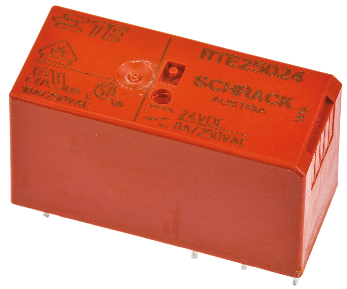 This is DPDT Non-Latching Relay PCB Mount 24V dc Coil 8 A manufactured by TE Connectivity. The manufacturer part number is RTE25024. It has a maximum operating temperature of +85°c. The product is available in pcb mount configuration. The product rt2, is a highly preferred choice for users. Latching Options - no. The coil voltage of the product is 24v dc. Its accurate length is 29mm. In addition, the height is 15.7mm. It is integrated with 8a switching current. Applications Information involves power. The product comes in 12.7mm depth. Whereas, the minimum operating temperature of the product is -40°c. The contact is equipped with dpdt configuration. It also features an AC switching power of 2 kva. The product is made from sturdy gold plated materials. It has equipped with 2 poles. The terminal is a through hole type. It holds up to 1440ω coil resistance.