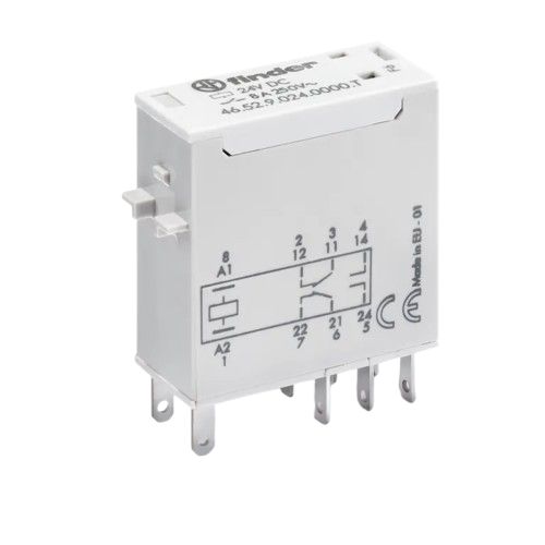 This is DPDT Non-Latching Relay Plug In 24V dc Coil 8 A manufactured by Finder. The manufacturer part number is 46.52.9.024.0000T. The coil voltage of the product is 24v dc. Applications Information involves railways. The terminal is a quick connect type. It holds up to 1200ω coil resistance. It is capable of doing 100000 (electrical) cycles in a lifetime . Robust coil power of 1.2w. The product has 6kv isolation coil to contact. It has a maximum operating temperature of +70°c. It is integrated with 8a switching current. Latching Options - no. The contact is equipped with dpdt configuration. The product comes in 12.4mm depth. The product is available in plug in configuration. The product 46 series, is a highly preferred choice for users. Its accurate length is 29mm. In addition, the height is 32.8mm. It has a maximum AC switching voltage of 440v ac. Whereas, the minimum operating temperature of the product is -40°c. It also features an AC switching power of 2 kva. It has equipped with 3 poles. The product is made from sturdy silver alloy materials.