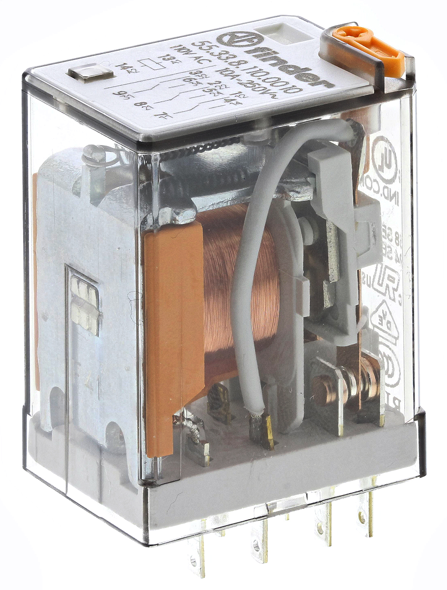 This is 3PDT Non-Latching Relay Plug In 110V ac Coil 10 A manufactured by Finder. The manufacturer part number is 55.33.8.110.0010. The coil voltage of the product is 110v ac. It consists of single coils. Applications Information involves general purpose. The terminal is a plug in type. It holds up to 4000ω coil resistance. It is capable of doing 200 x 10³ cycles in a lifetime . The product complies with all safety standards, such as curus, eac. Robust coil power of 1.5w. While it carries 220v dc of maximum DC switching voltage. The product has 4kv isolation coil to contact. It has a maximum operating temperature of +85°c. It is integrated with 10a switching current. It has a maximum 20 a switching current AC . Whereas, the minimum operating temperature of the product is -40°c. Latching Options - no. The contact is equipped with 3pdt configuration. The product comes in 20.7mm depth. The product is available in plug in configuration. The product 55 series, is a highly preferred choice for users. Its accurate length is 27.7mm. In addition, the height is 37.2mm. It has a maximum AC switching voltage of 400v ac. It has equipped with 3 poles. The product is made from sturdy silver alloy materials.