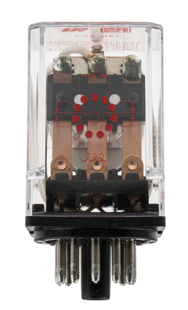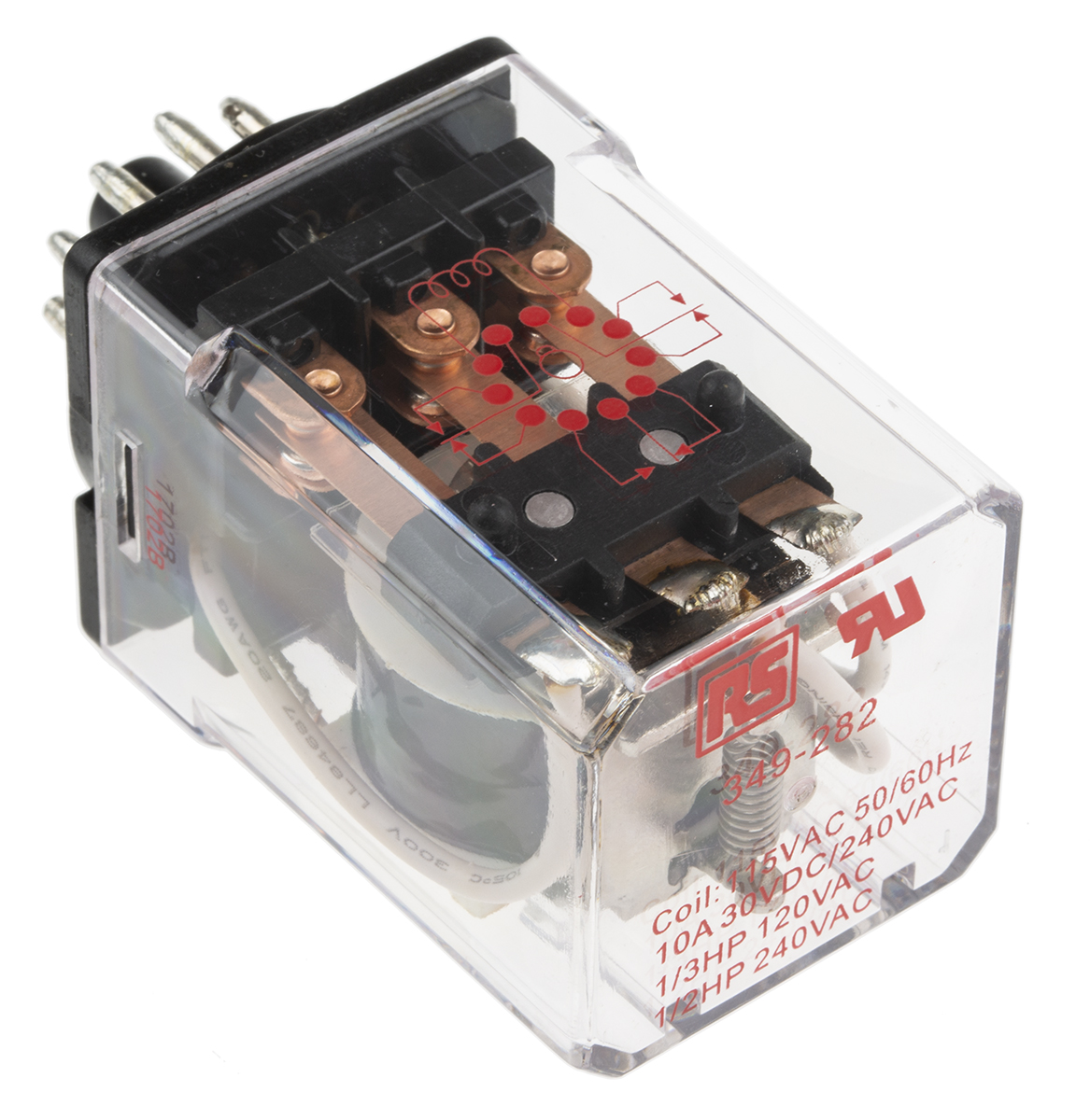 This is 3PDT Non-Latching Relay Plug In 115V ac Coil 10 A General Purpose Relay manufactured by RS Pro. The manufacturer part number is 349-282. The coil voltage of the product is 115v ac. Applications Information involves power. The terminal is a through hole type. It holds up to 2000ω coil resistance. It is capable of doing 10000000 (mechanical) cycles in a lifetime . The product complies with all safety standards, such as cur e125370, ul e125370. Robust coil power of 2.75w. While it carries 30v dc of maximum DC switching voltage. It bears a maximum 300 w of DC switching power. The product has 1.5kv ac isolation coil to contact. It has a maximum operating temperature of +55°c. It is integrated with 10a switching current. Latching Options - no. The contact is equipped with 3pdt configuration. The product comes in 35mm depth. The product is available in plug in configuration. Its accurate length is 35mm. In addition, the height is 56mm. It has a maximum AC switching voltage of 240v ac. Whereas, the minimum operating temperature of the product is -45°c. It also features an AC switching power of 2.4 kva. It has equipped with 3 poles. The product is made from sturdy silver alloy materials.
