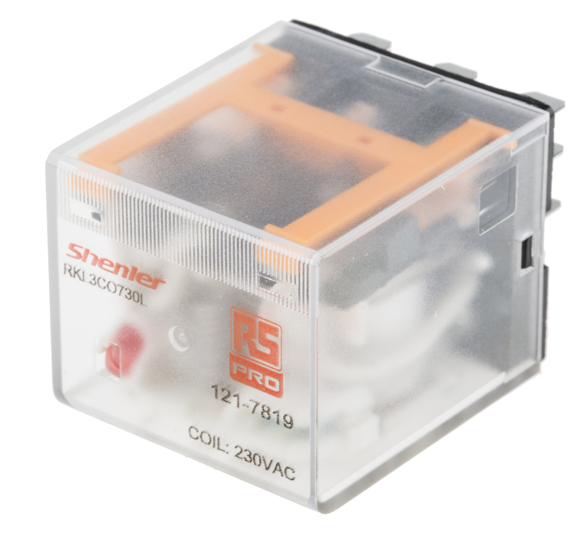This is 3PDT Non-Latching Relay Plug In 230V ac Coil 10 A Non-Latching Relay manufactured by RS Pro. The manufacturer part number is 121-7819. The coil voltage of the product is 230v ac. Applications Information involves general purpose. The terminal is a plug in type. It is capable of doing 100000 (electrical) cycles, 10000000 (mechanical) cycles in a lifetime . The product complies with all safety standards, such as ce, cqc, culus, rohs compliant. Robust coil power of 300w. While it carries 30v dc of maximum DC switching voltage. It bears a maximum 1.4 w of DC switching power. The product has 2kv ac isolation coil to contact. It has a maximum operating temperature of +55°c. It is integrated with 10a switching current. Latching Options - no. The contact is equipped with 3pdt configuration. The product comes in 28mm depth. The product is available in plug in configuration. Its accurate length is 31.5mm. In addition, the height is 36.5mm. It has a maximum AC switching voltage of 250v ac. Whereas, the minimum operating temperature of the product is -25°c. It also features an AC switching power of 2va. It has equipped with 3 poles. The product is made from sturdy silver alloy materials.